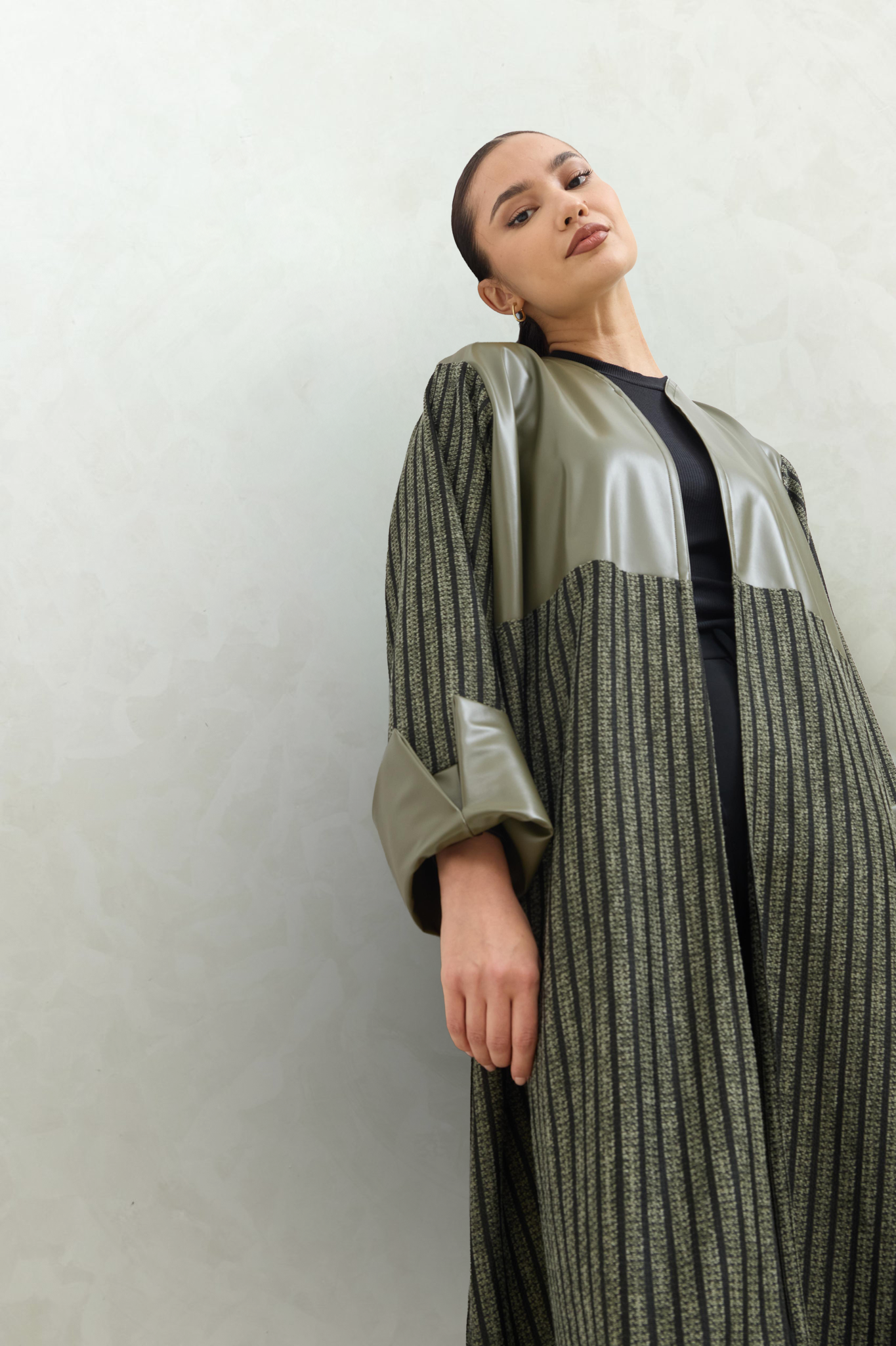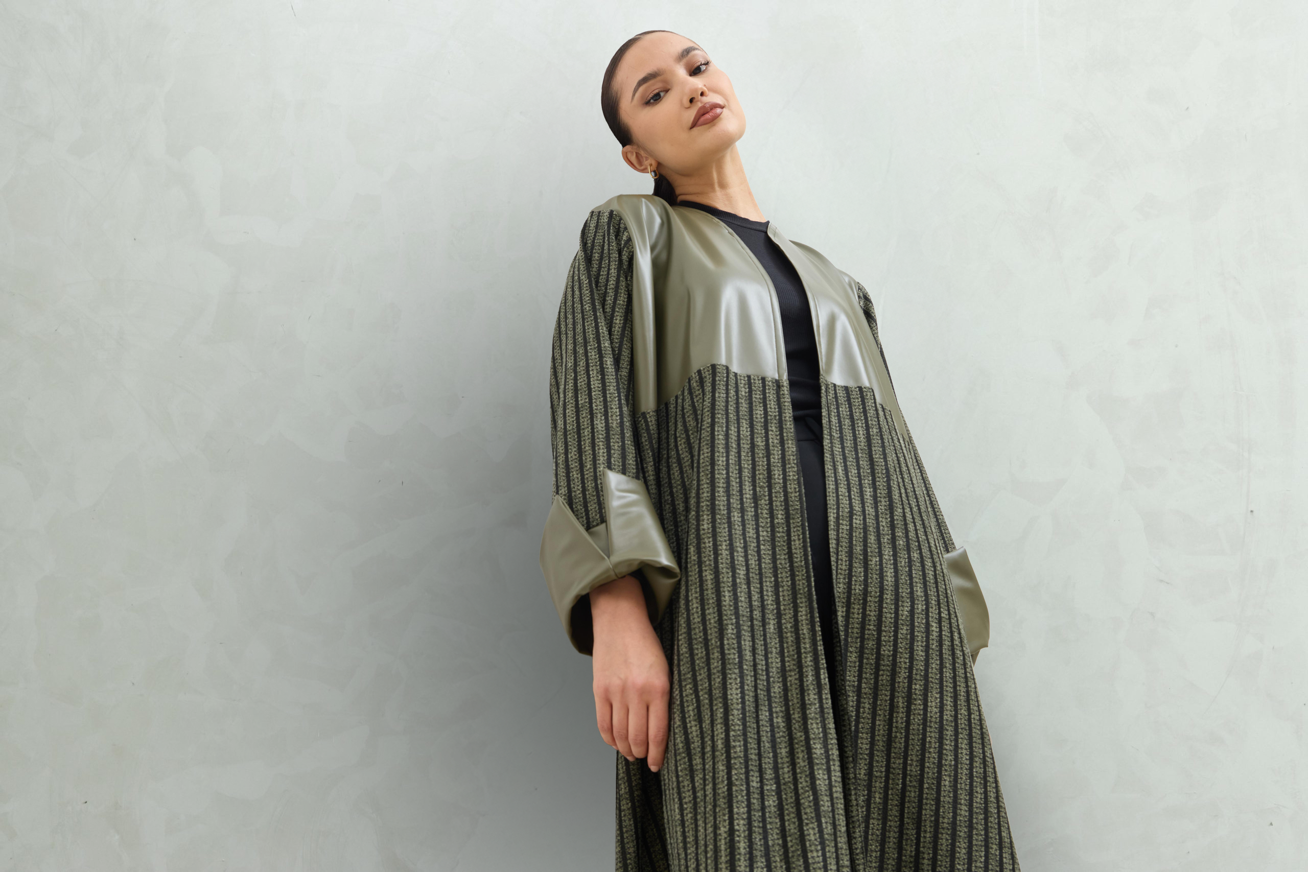 عباية شتوية بقصة عادية، تجمع بين قماش شانيل المخطط بدرجات الرمادي مع جلد أسود فاخر على الصدر والأكمام، بتصميم أنيق يناسب الإطلالات العصرية في الأجواء الباردة.