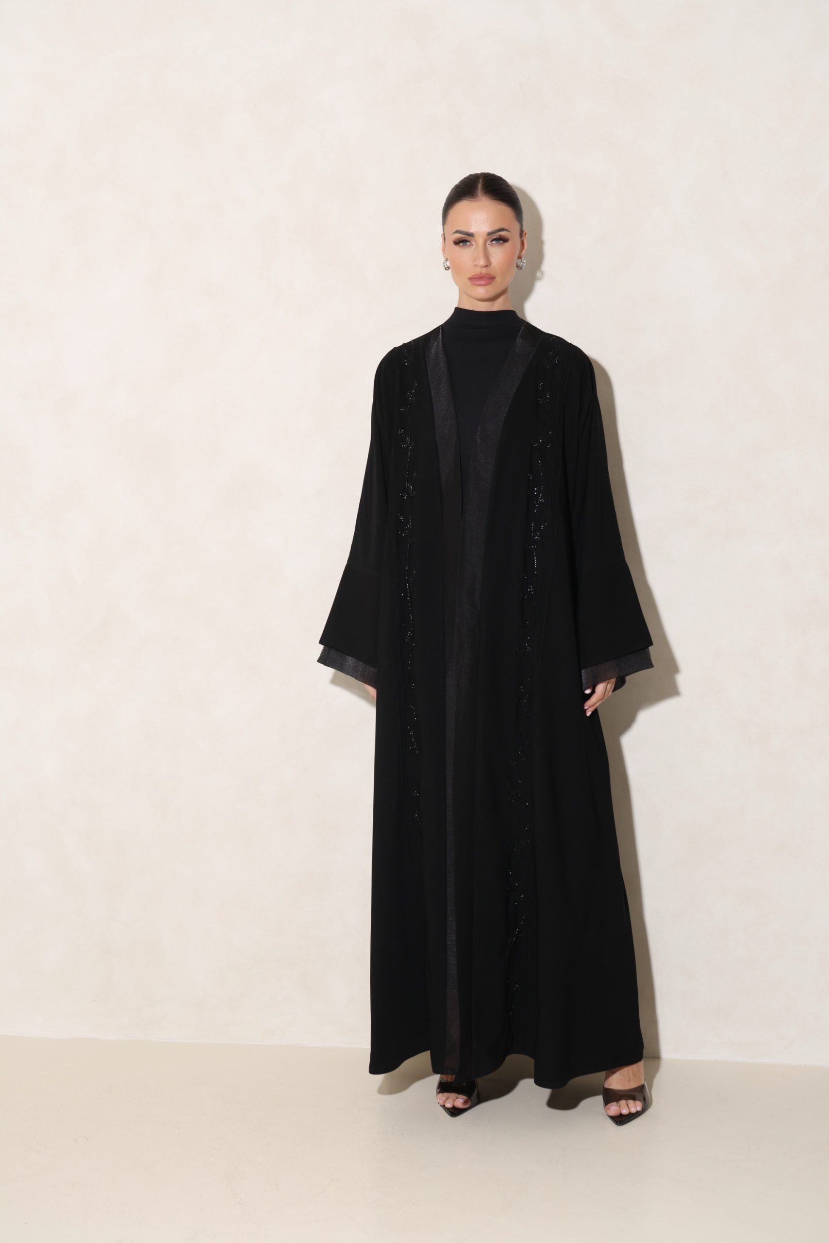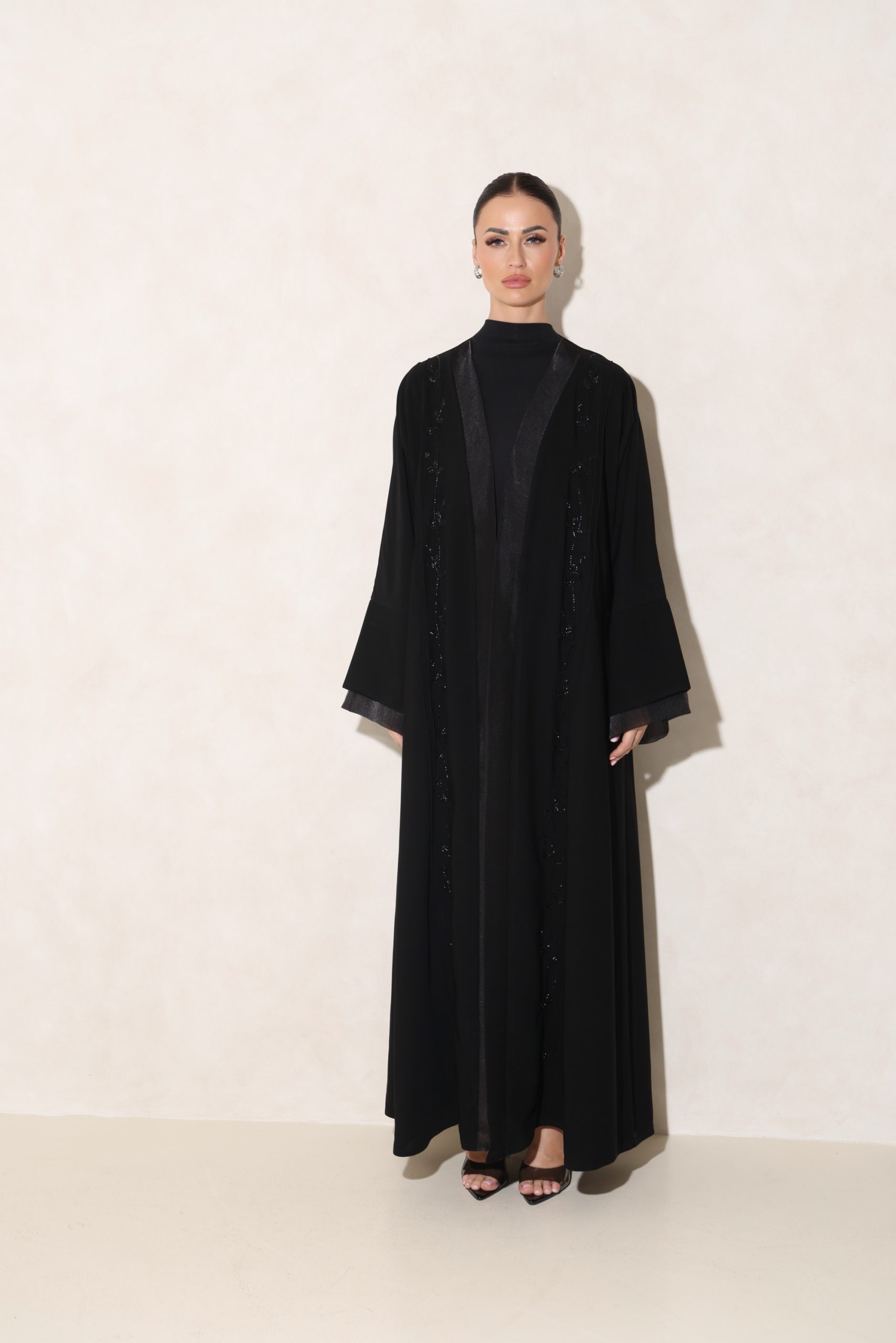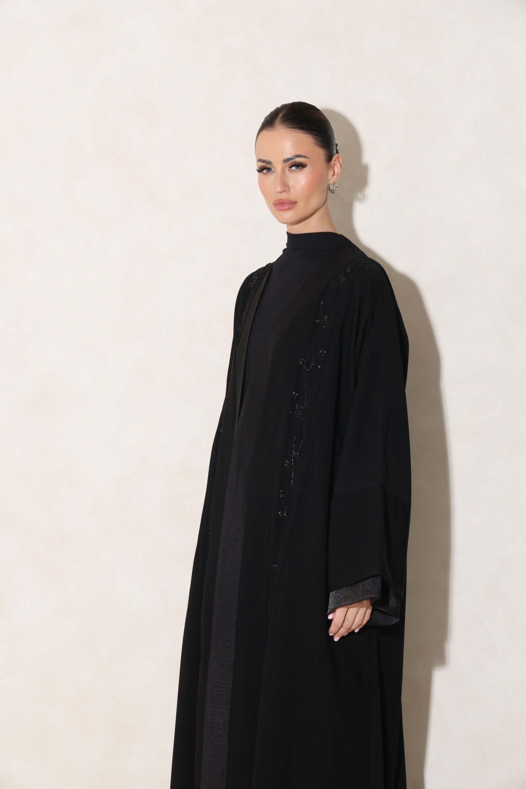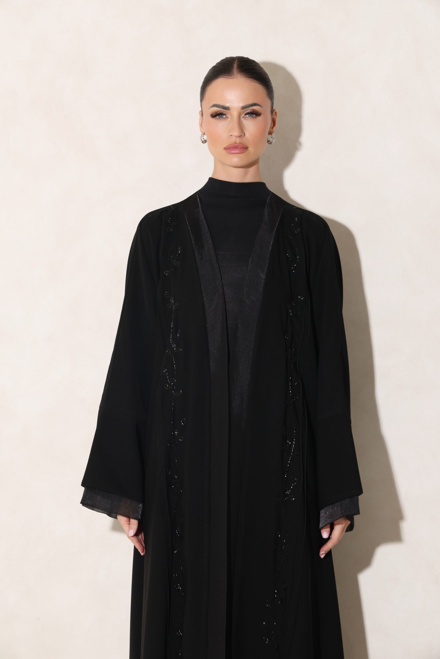 عباية من قماشنا الفاخر، بتدخيلة أورقنزا أنيقة على الأكمام والصدر، مع شك راقٍ من الأمام. تأتي بقصة ربع فراشة تمنح توازنًا مثاليًا بين الفخامة والانسيابية.