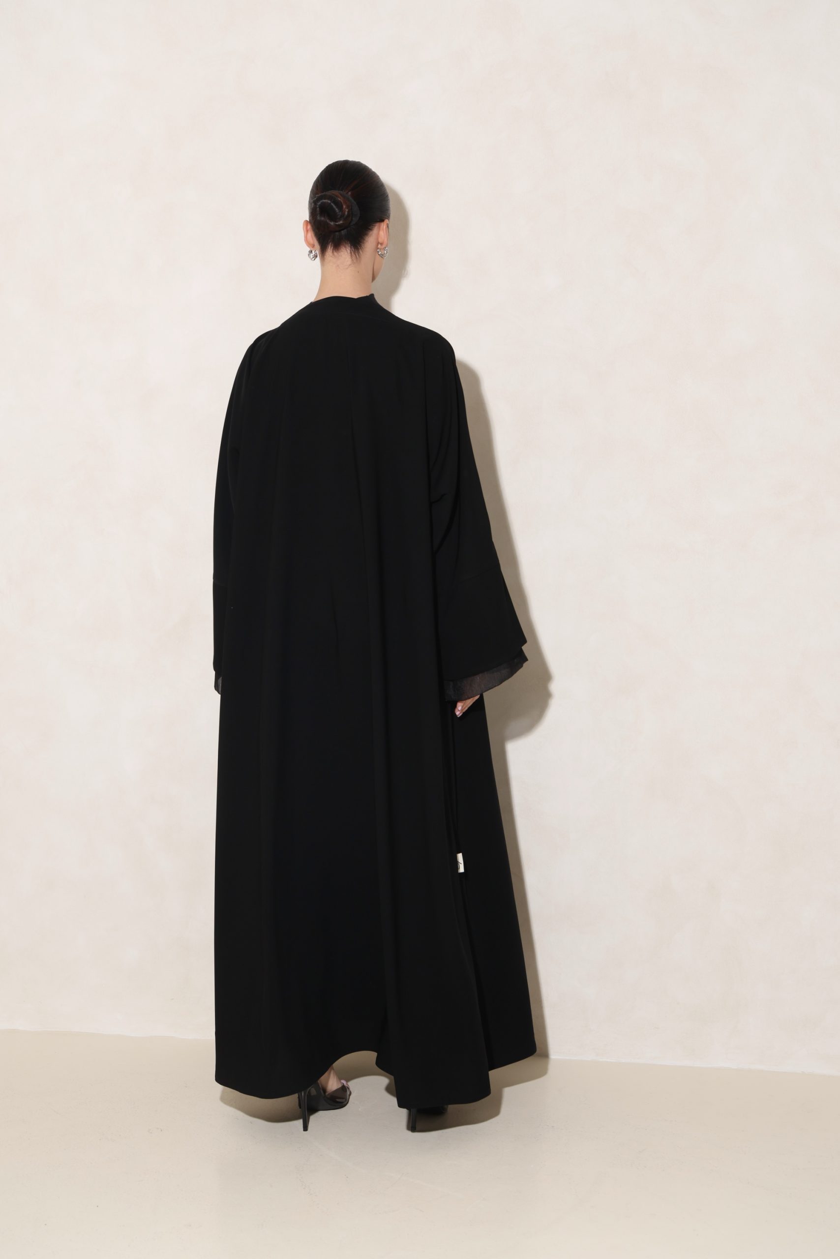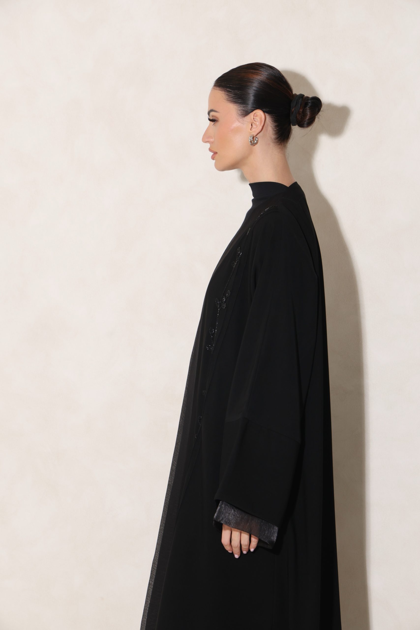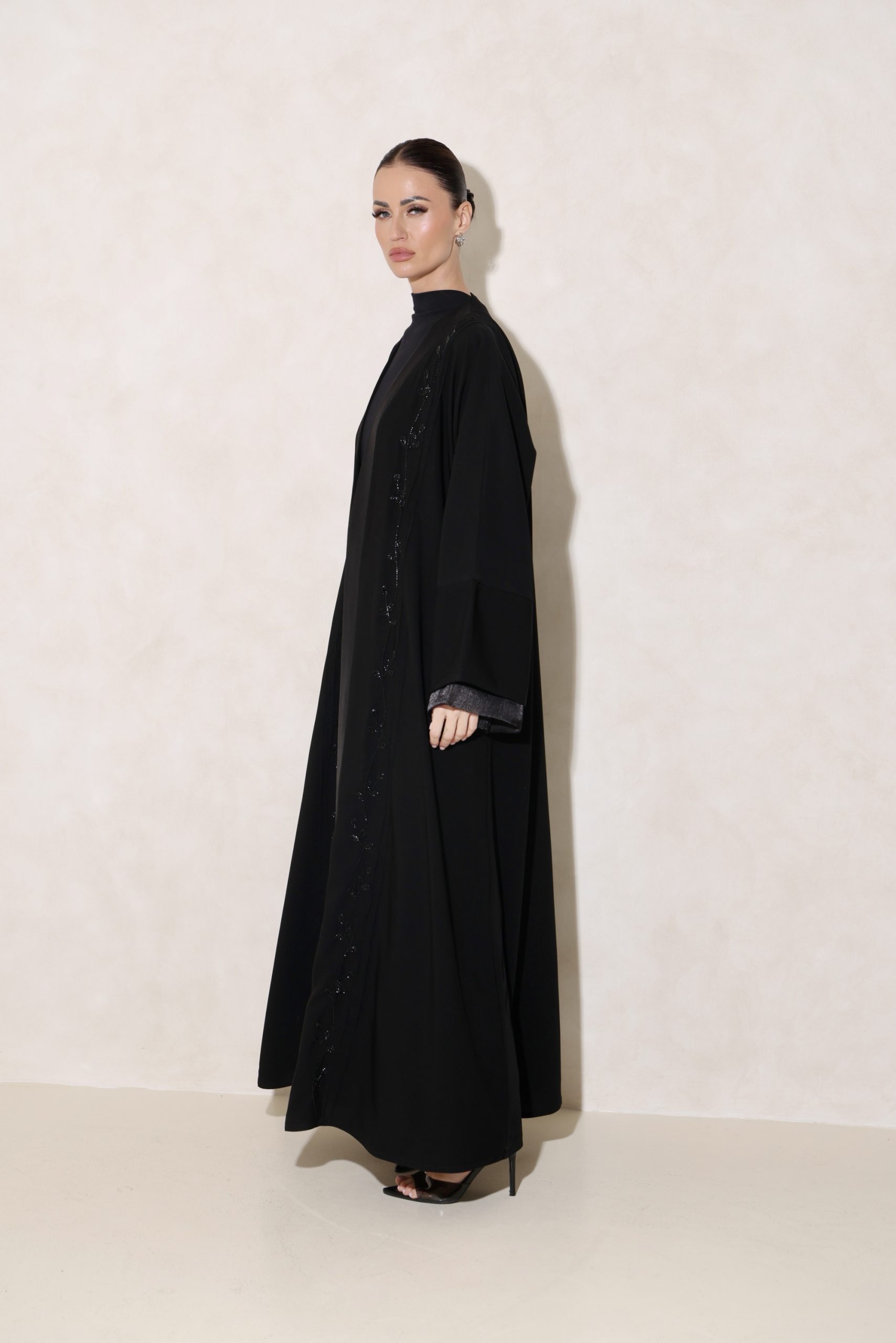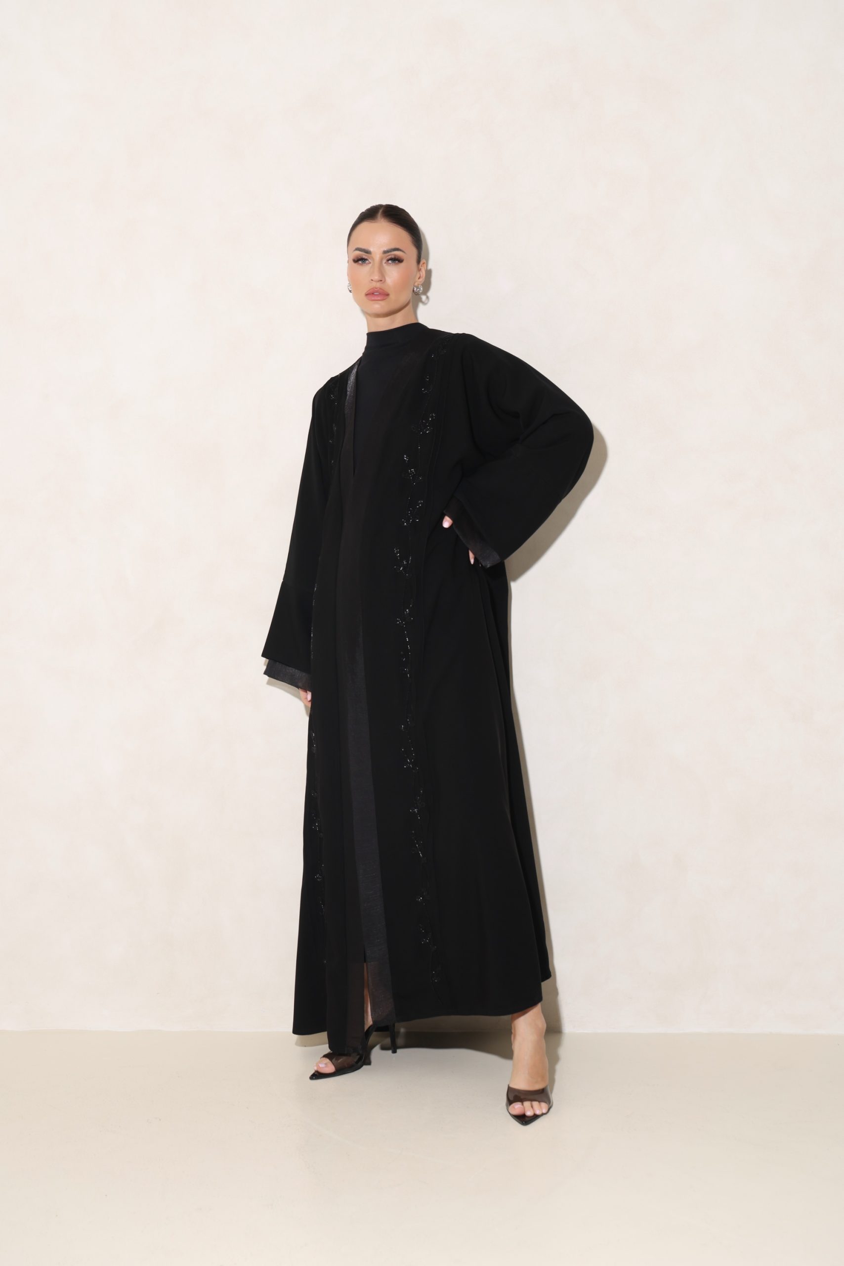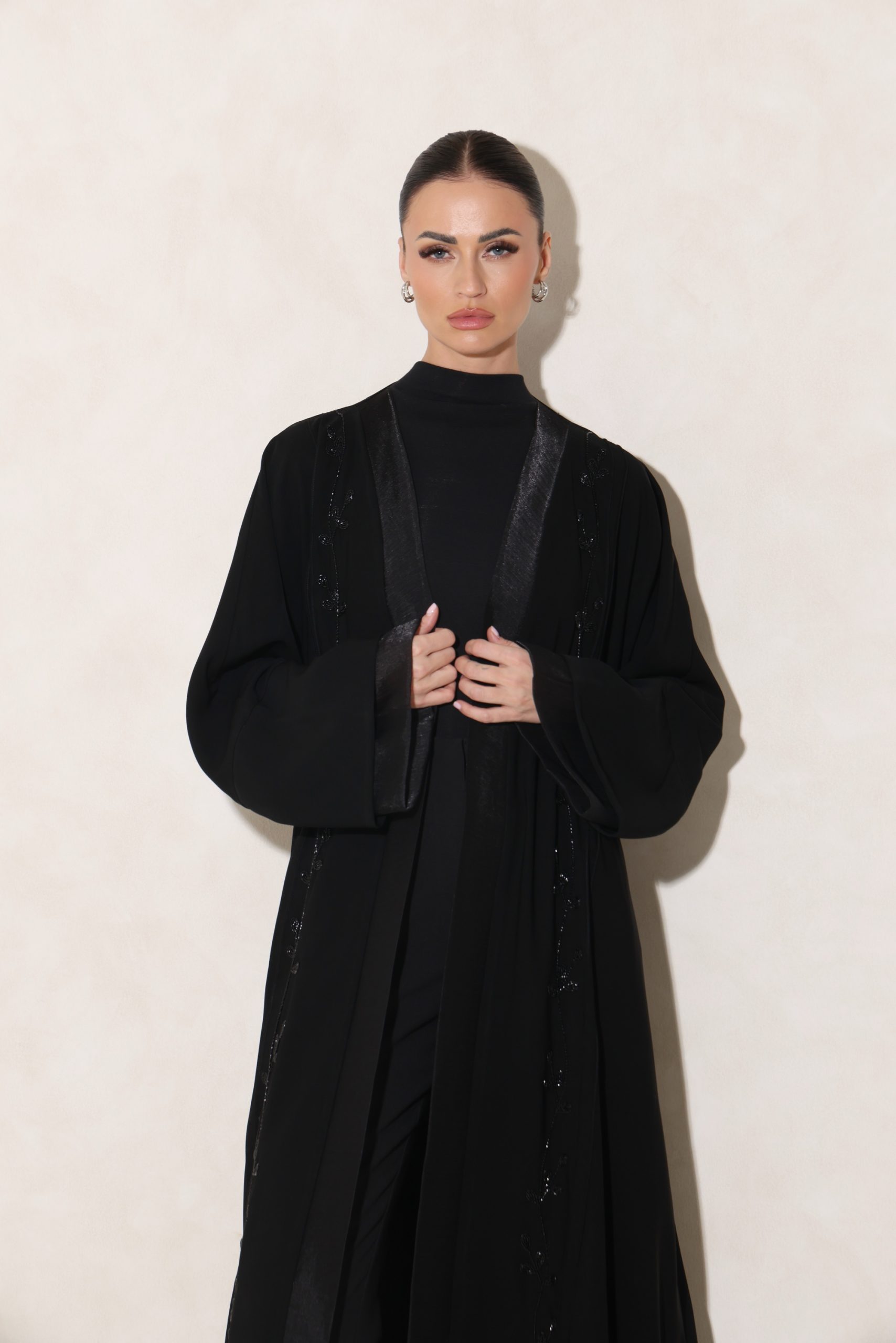 عباية من قماشنا الفاخر، بتدخيلة أورقنزا أنيقة على الأكمام والصدر، مع شك راقٍ من الأمام. تأتي بقصة ربع فراشة تمنح توازنًا مثاليًا بين الفخامة والانسيابية.