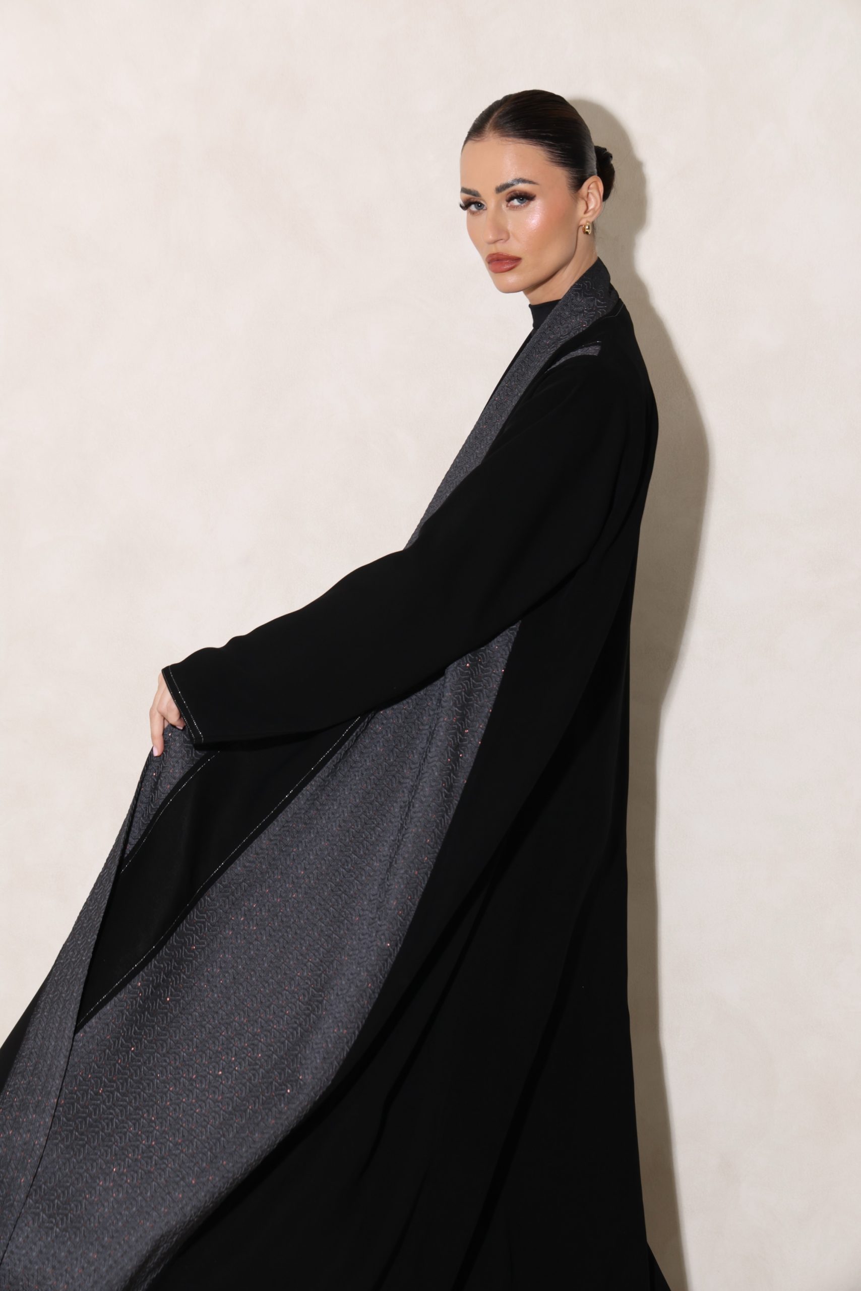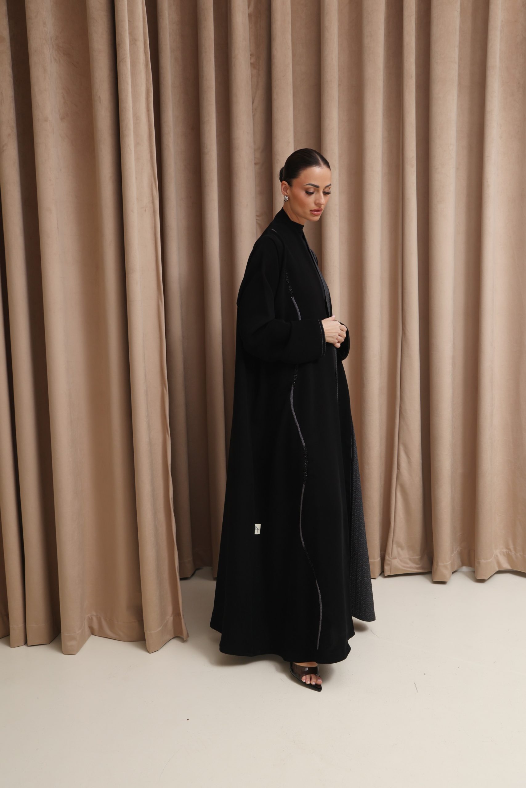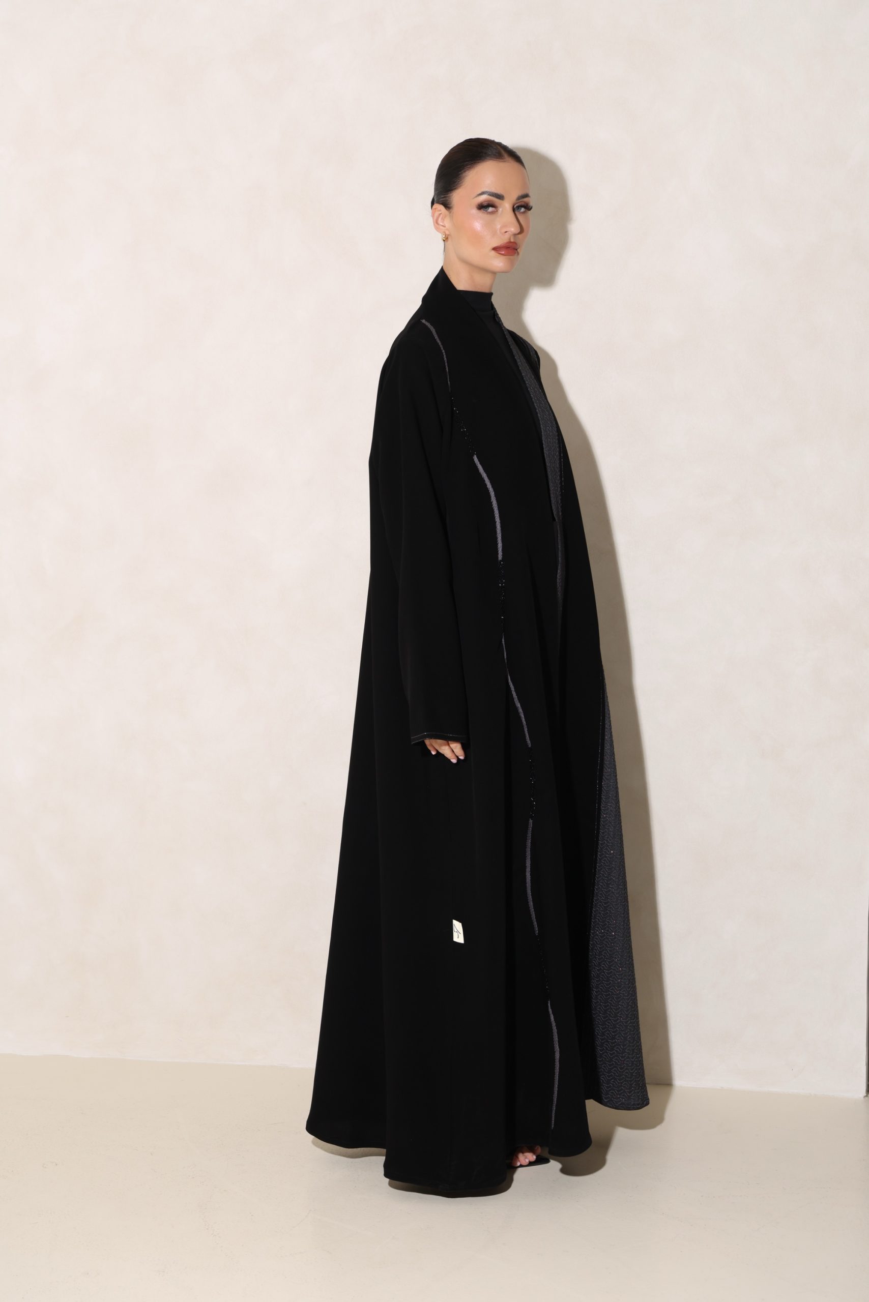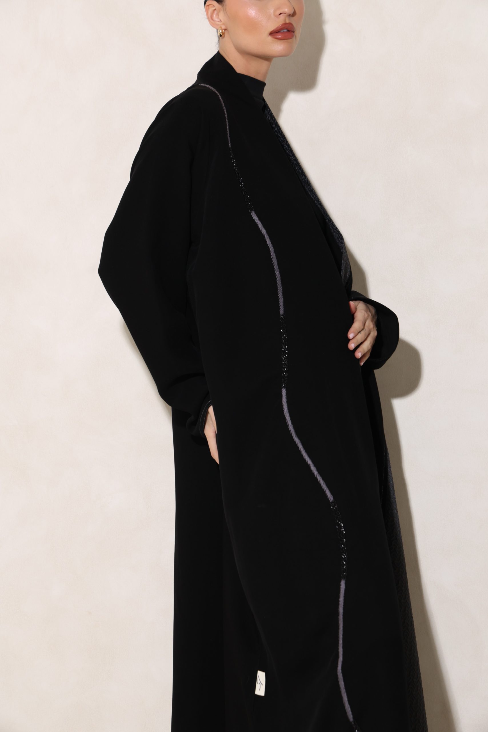 عباية بقصة كلوش من قماش الكوبرا الفيتنامي الفاخر، مزينة بتفاصيل تفتة رمادي منقش بلمسات ذهبية، مع خياطة زري دقيقة بالفضي المطفي وخياطة يدوية متقنة، إضافة إلى شك أنيق على الجانب يمنح التصميم لمسة راقية ومميزة.