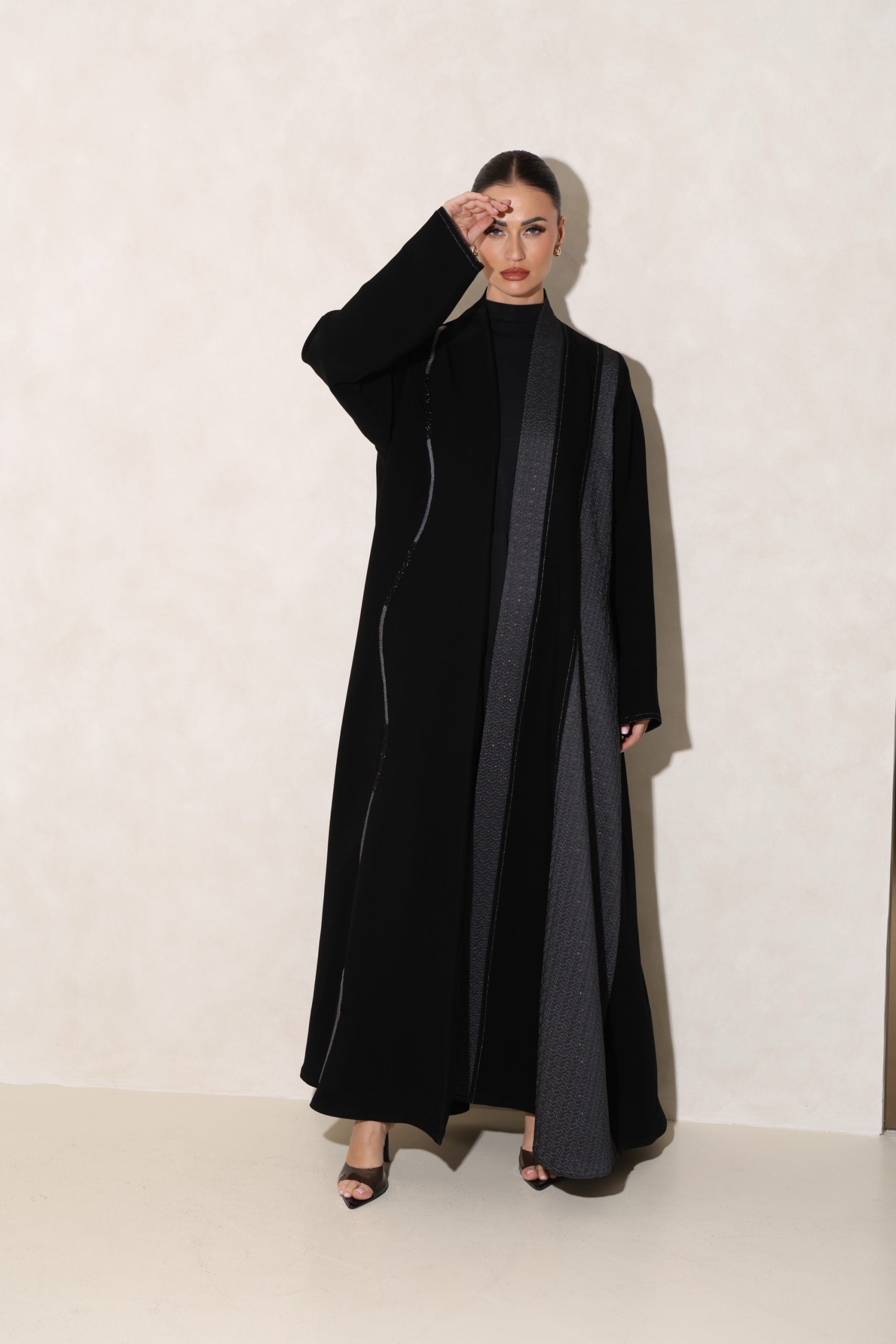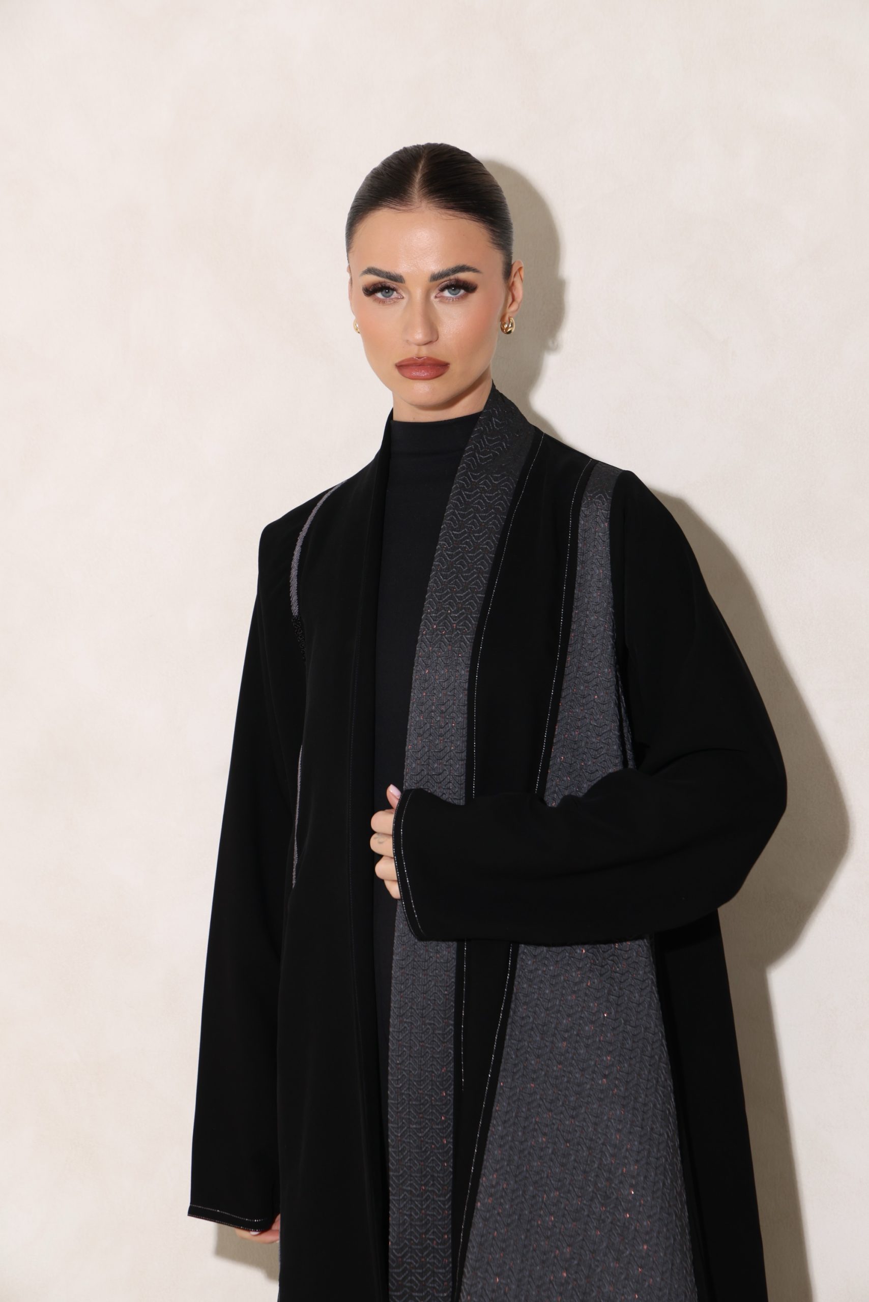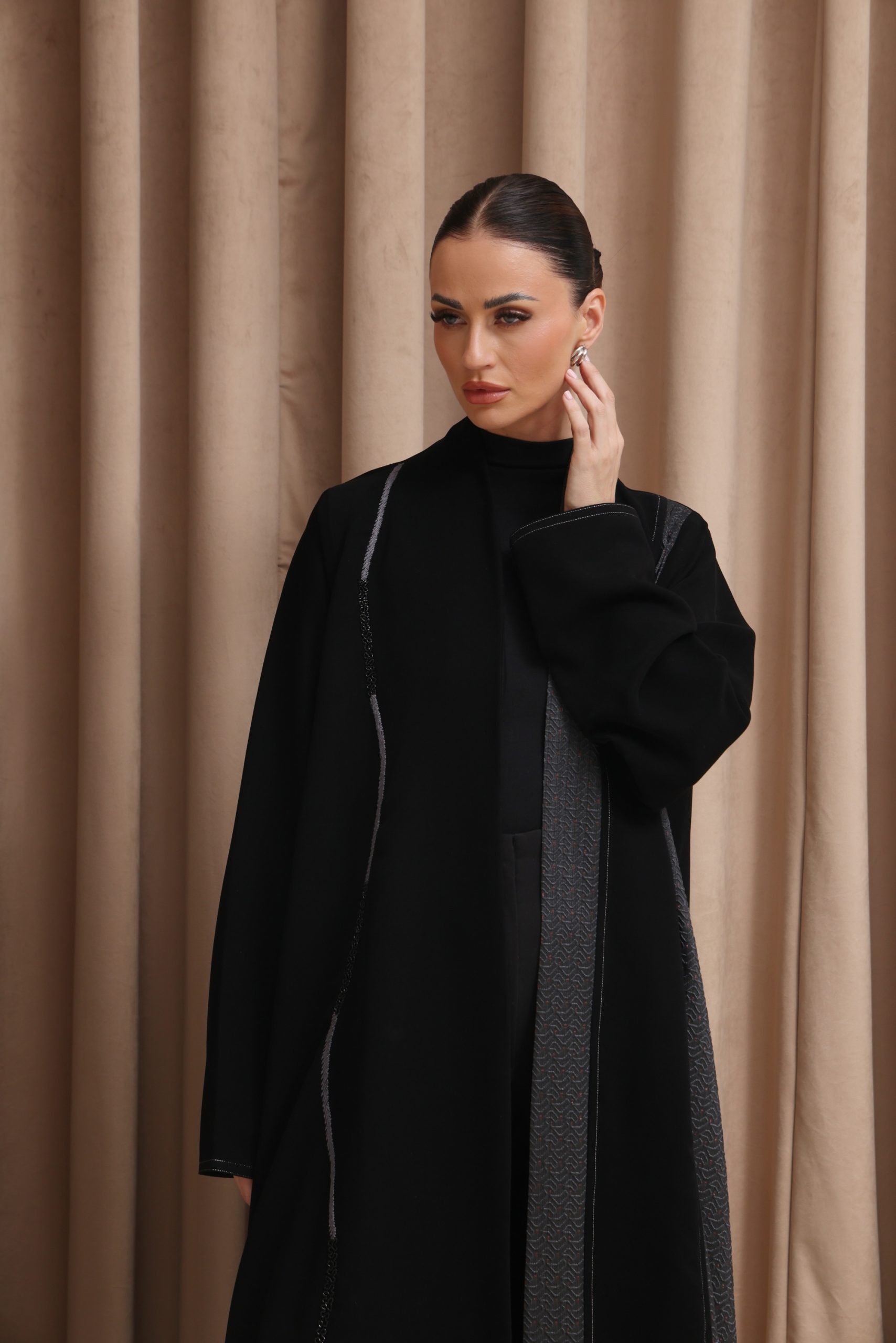 عباية بقصة كلوش من قماش الكوبرا الفيتنامي الفاخر، مزينة بتفاصيل تفتة رمادي منقش بلمسات ذهبية، مع خياطة زري دقيقة بالفضي المطفي وخياطة يدوية متقنة، إضافة إلى شك أنيق على الجانب يمنح التصميم لمسة راقية ومميزة.