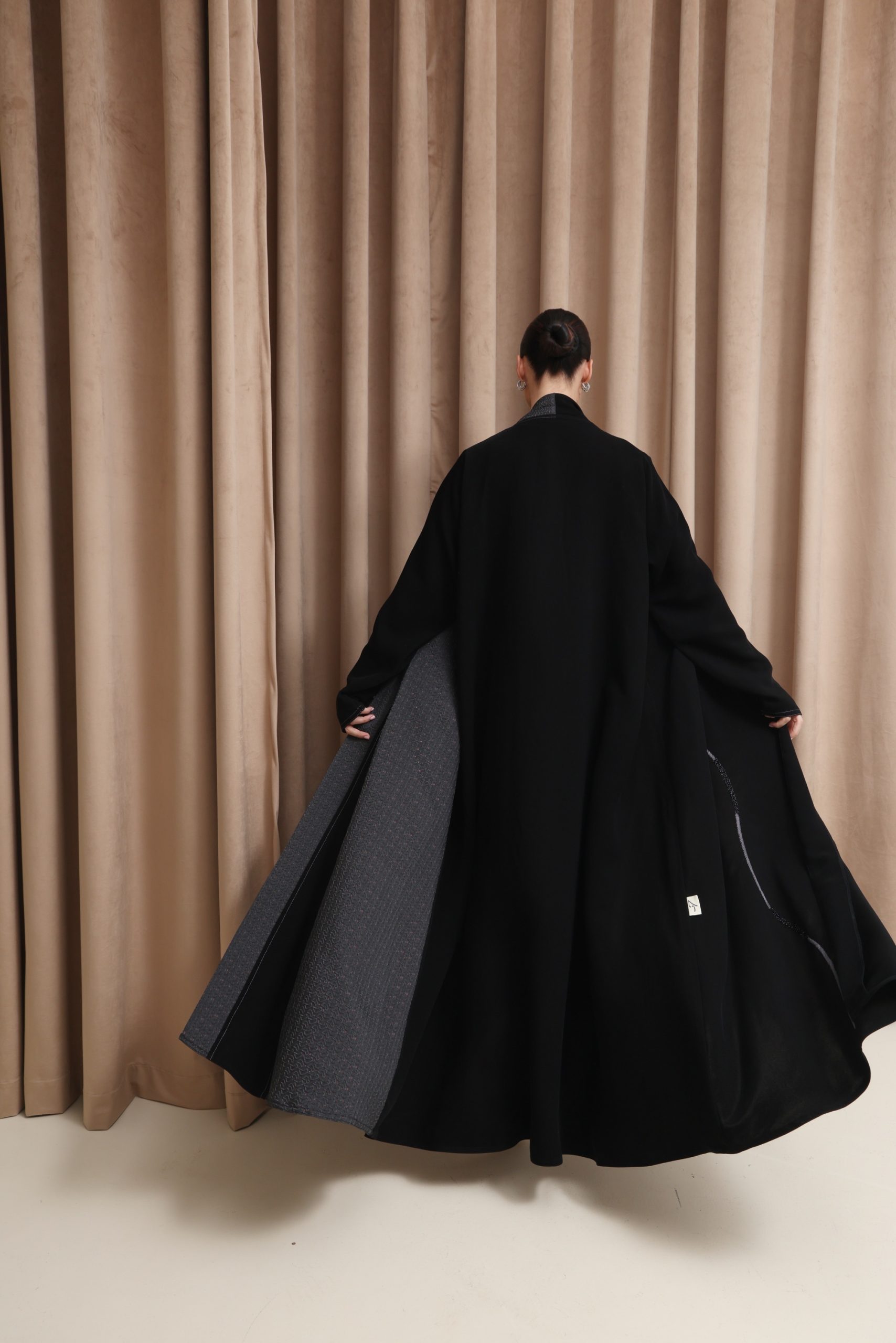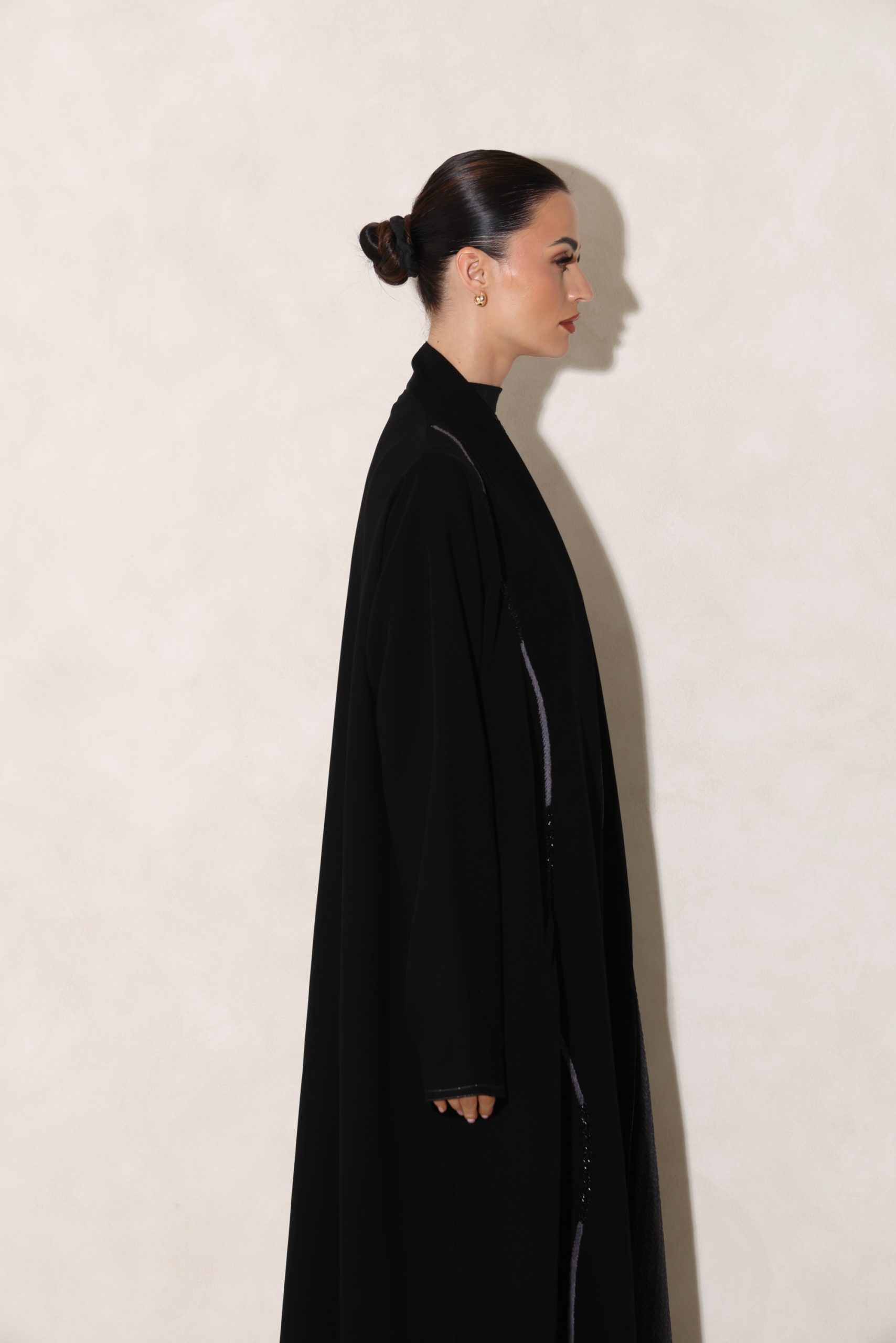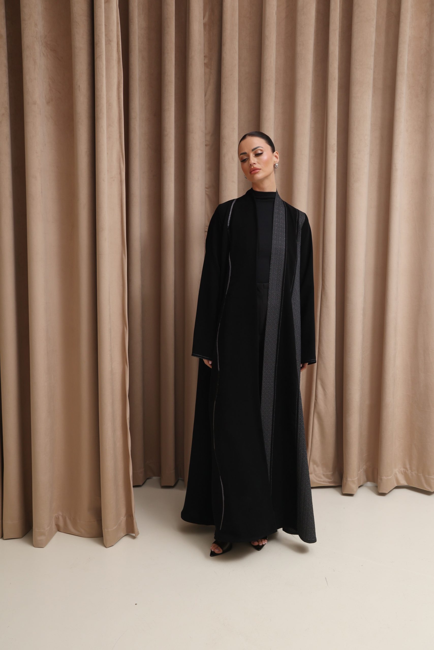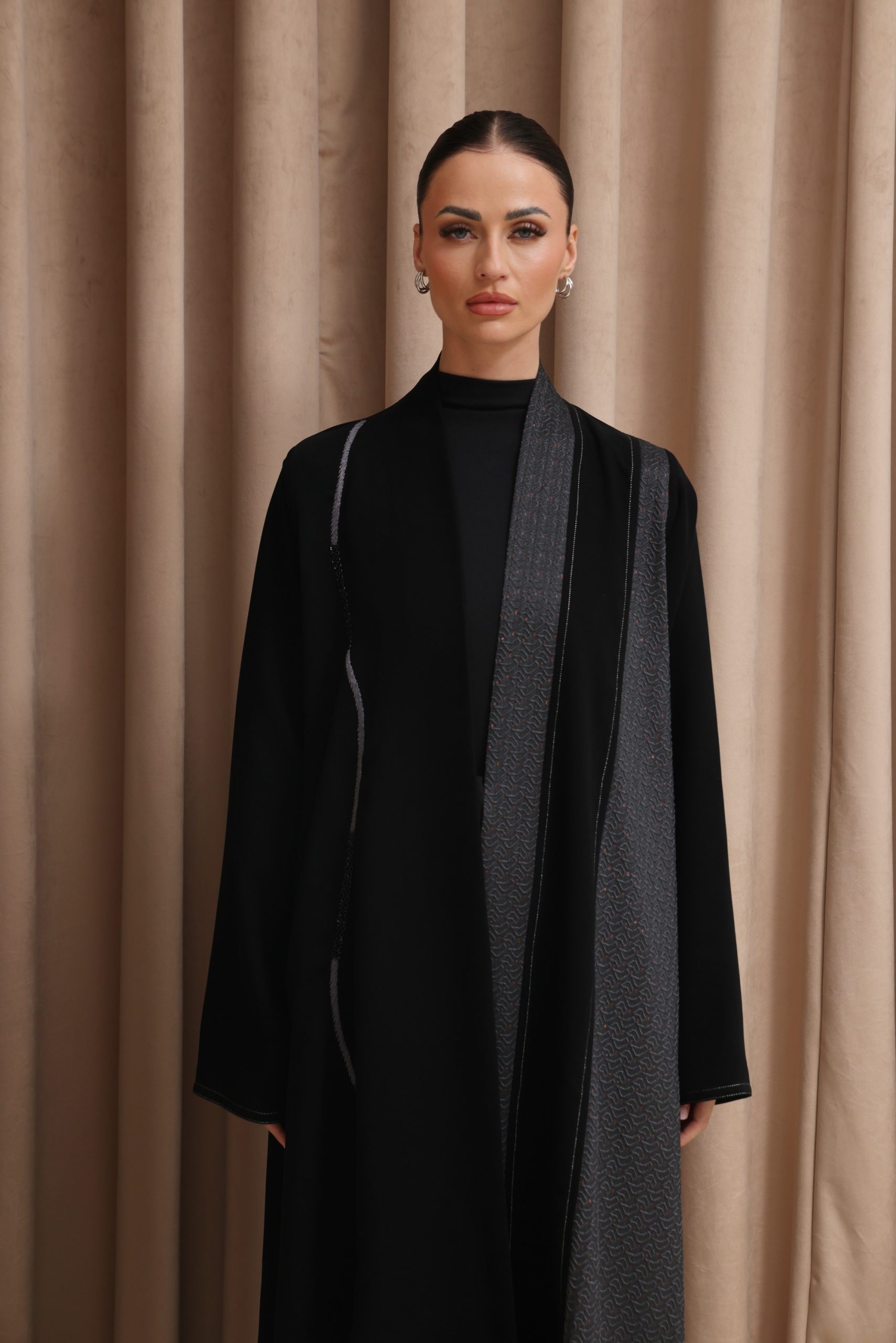 عباية بقصة كلوش من قماش الكوبرا الفيتنامي الفاخر، مزينة بتفاصيل تفتة رمادي منقش بلمسات ذهبية، مع خياطة زري دقيقة بالفضي المطفي وخياطة يدوية متقنة، إضافة إلى شك أنيق على الجانب يمنح التصميم لمسة راقية ومميزة.
