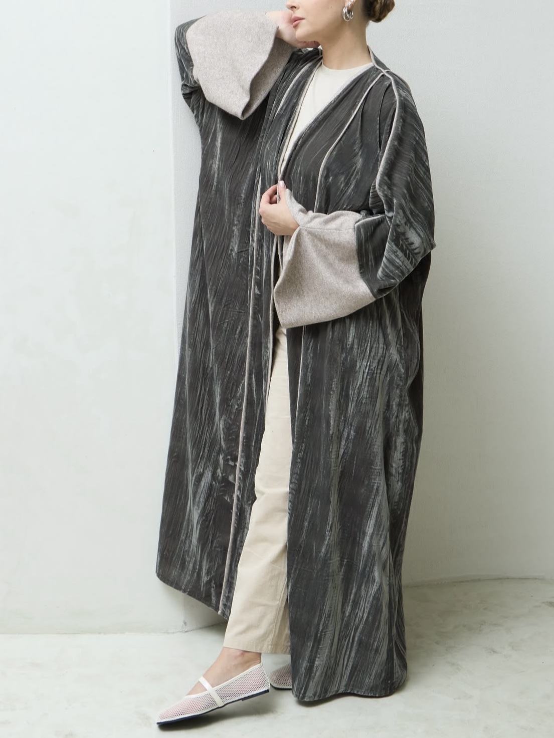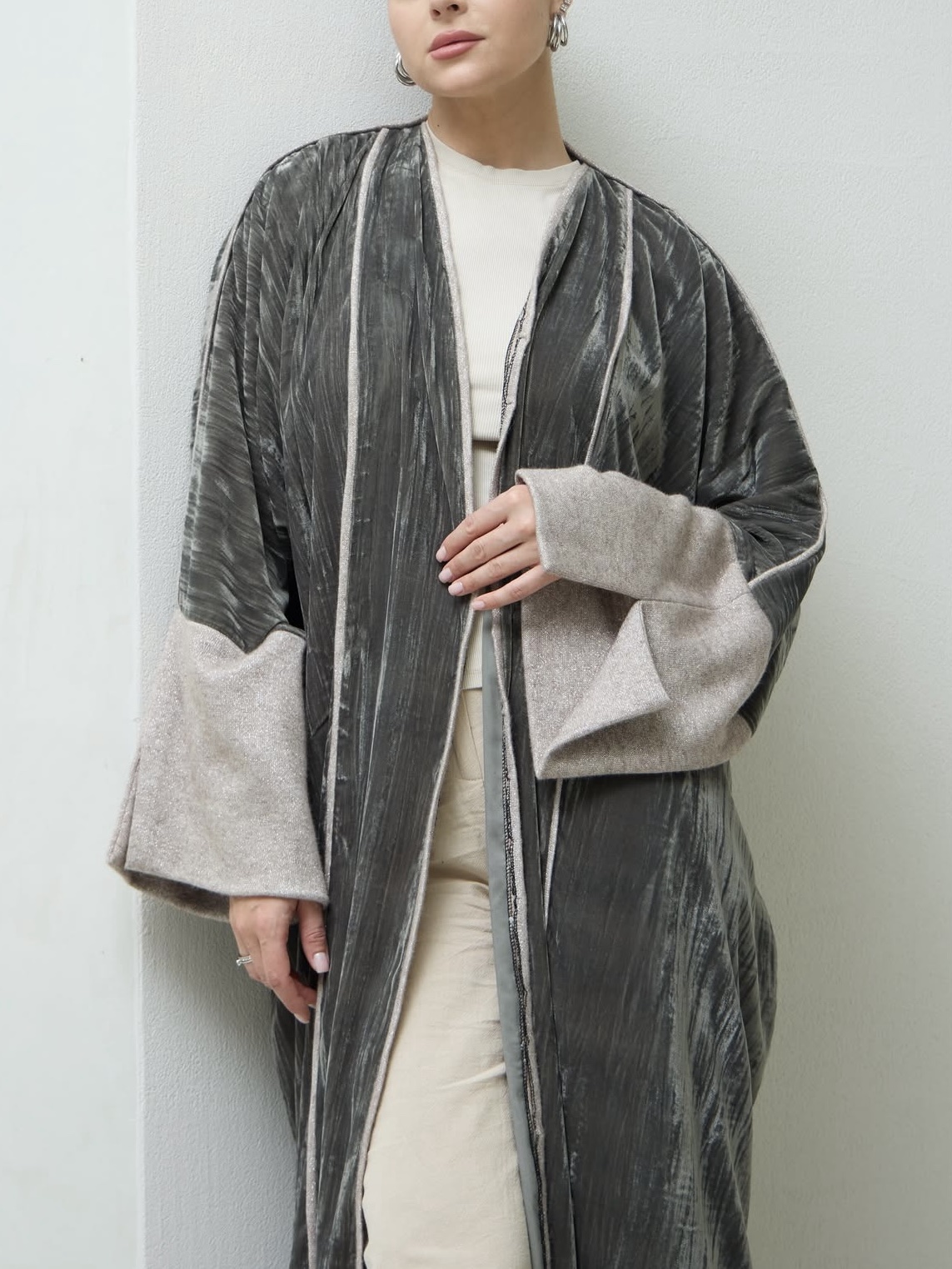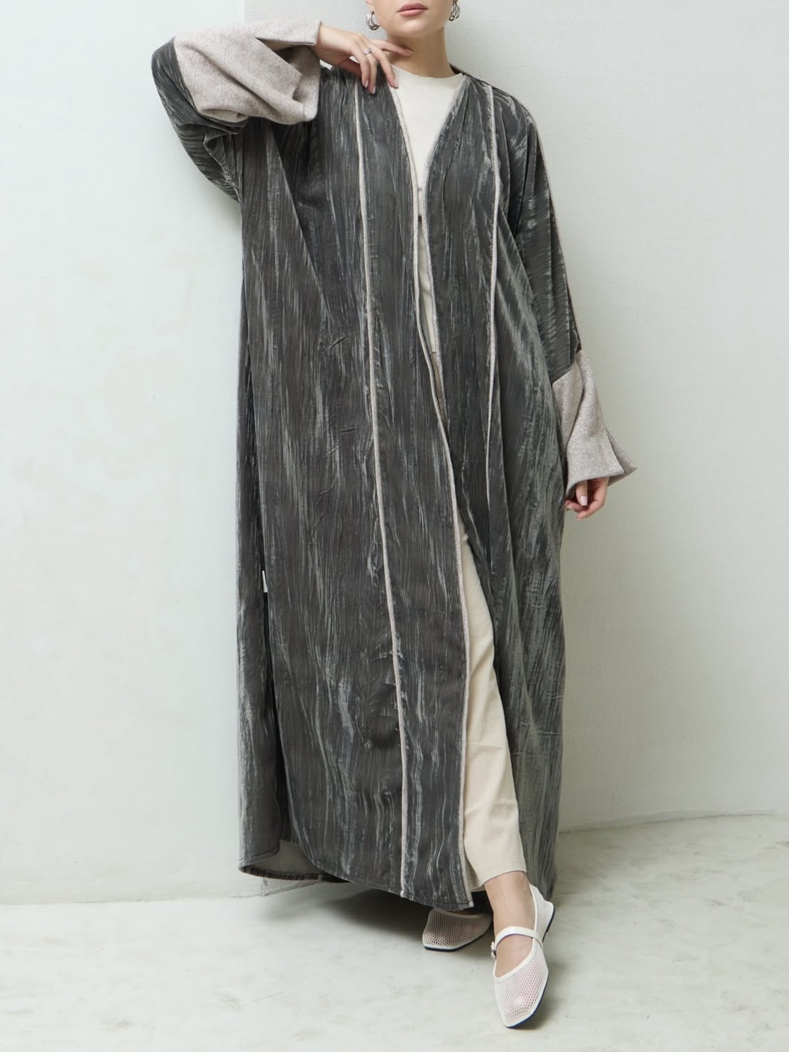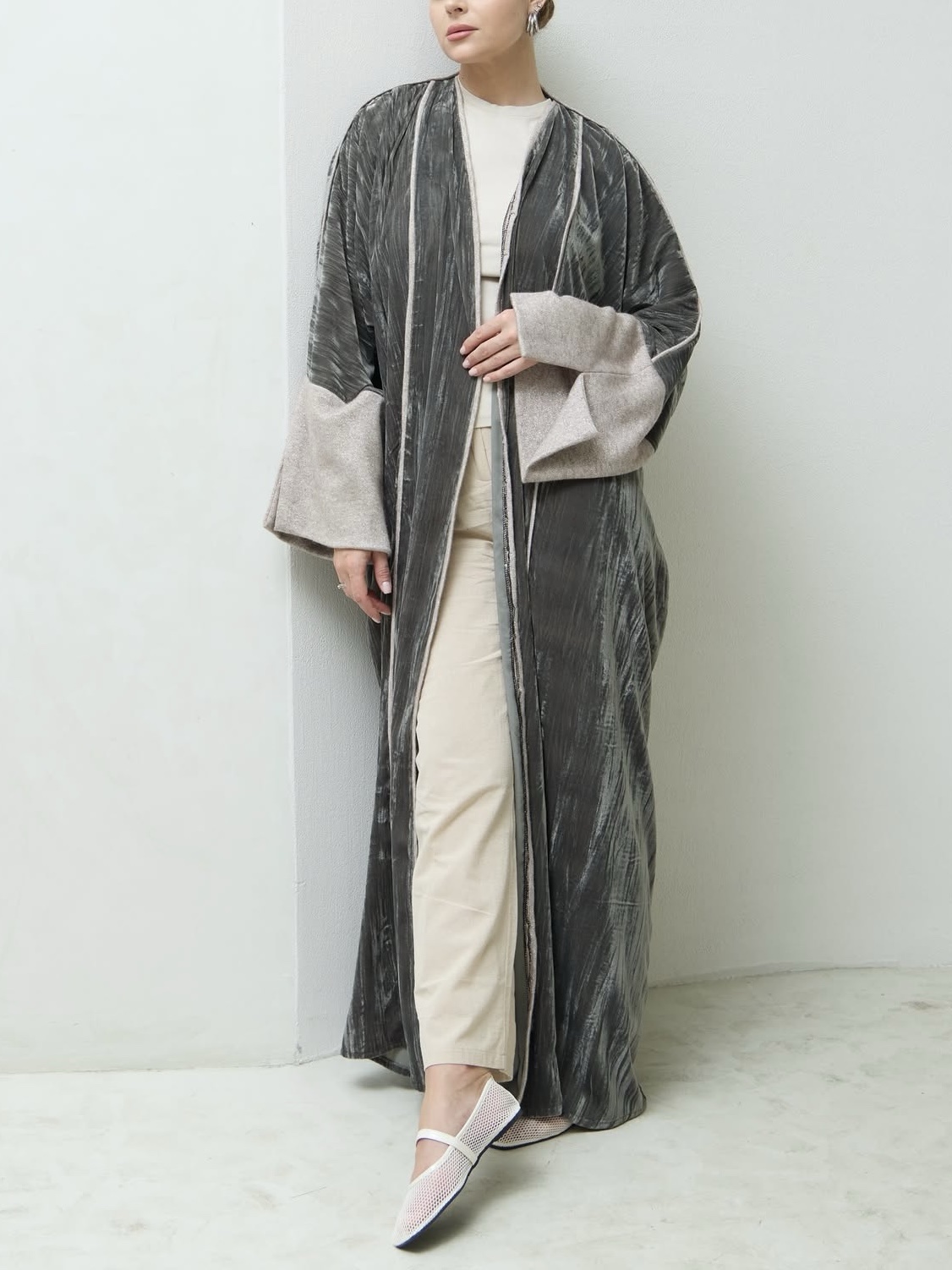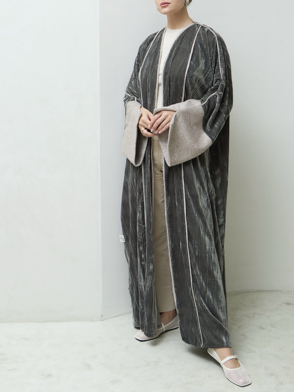 عباية بقصة فراشة فخمة من قماش مخمل مكسر بلون زيتي فاتح، مزينة بتفاصيل من قماش الصوف اللامع على الأكمام وعلى امتداد الفتحة الأمامية، تمنح إطلالة دافئة بلمسة فاخرة وأنيقة.