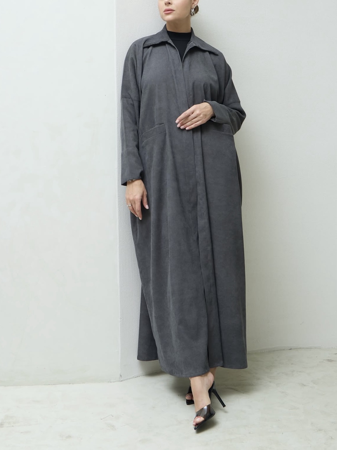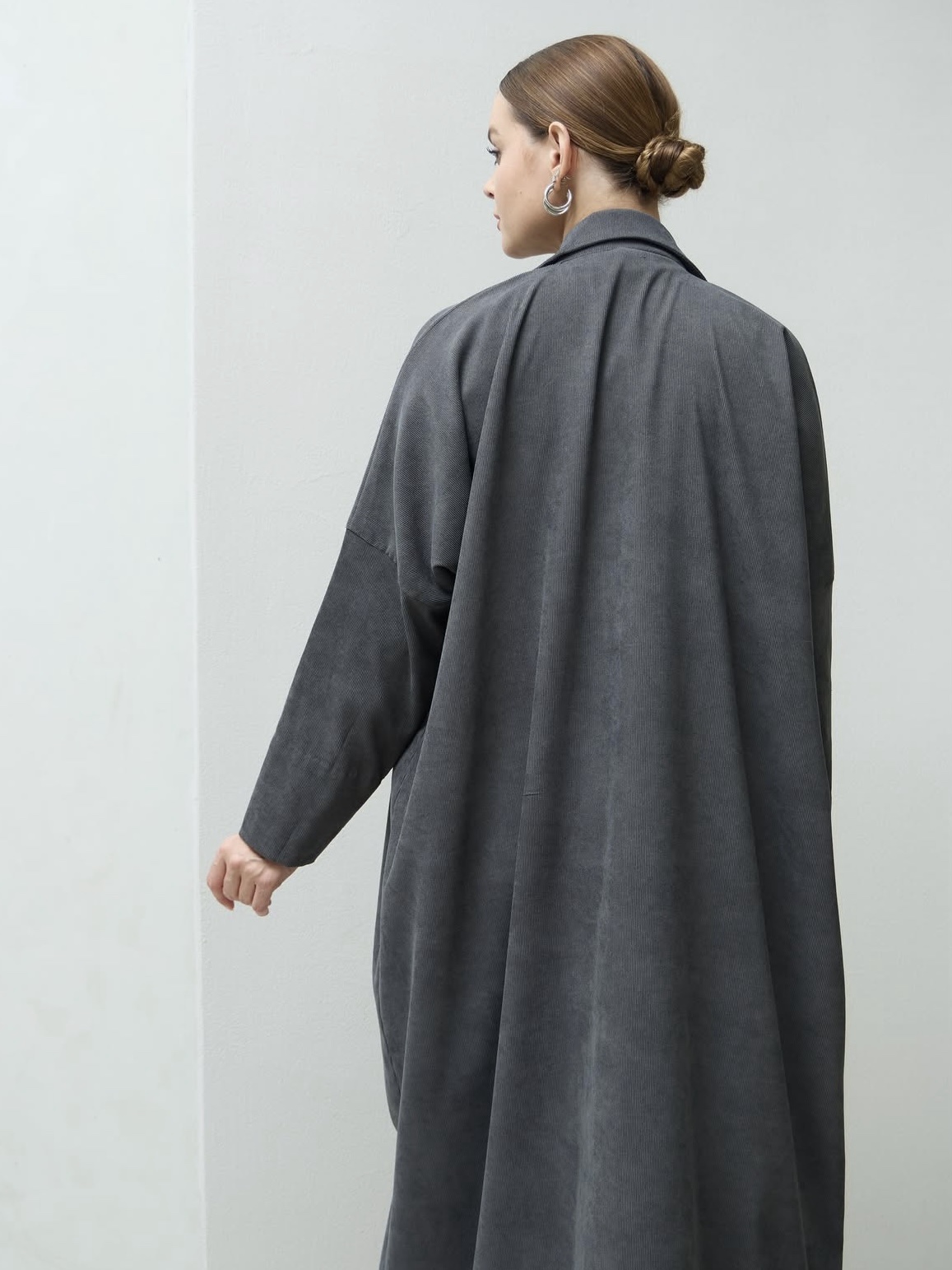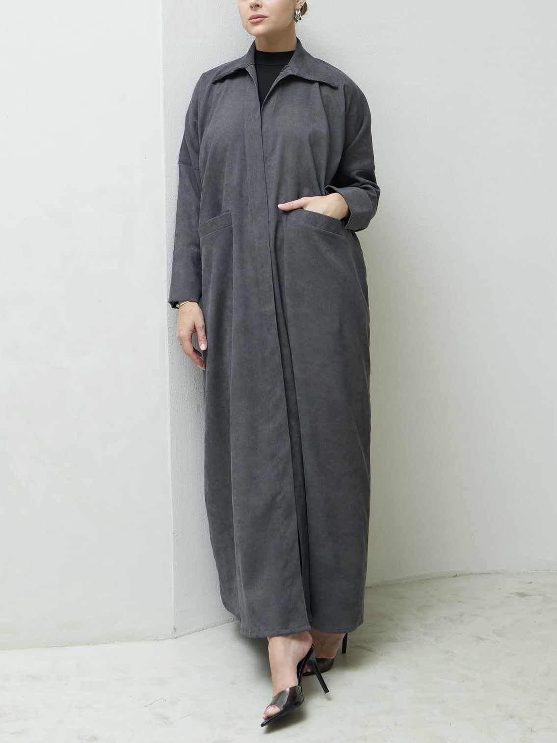 عباية تويد شتوية أنيقة بلون رمادي فاتح، بتصميم مستوحى من قصة الترنش الكلاسيكية، تجمع بين الفخامة والدفء بأسلوب عصري راقٍ.