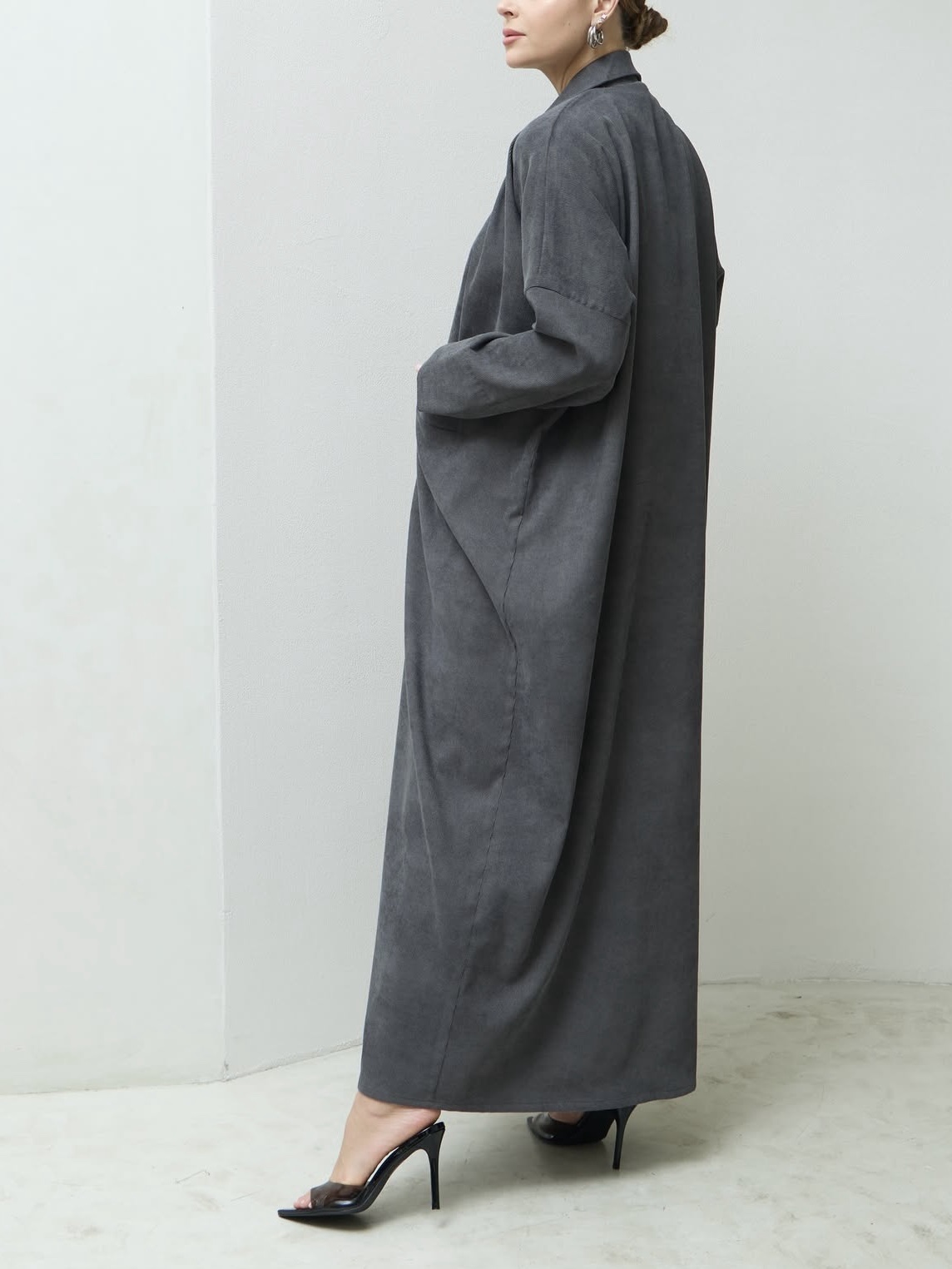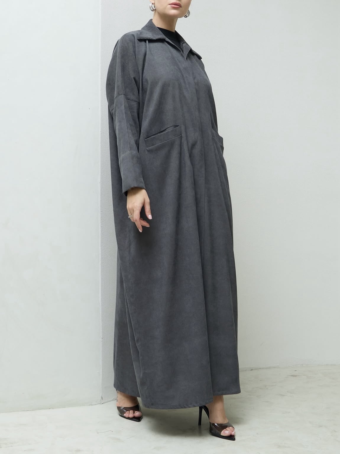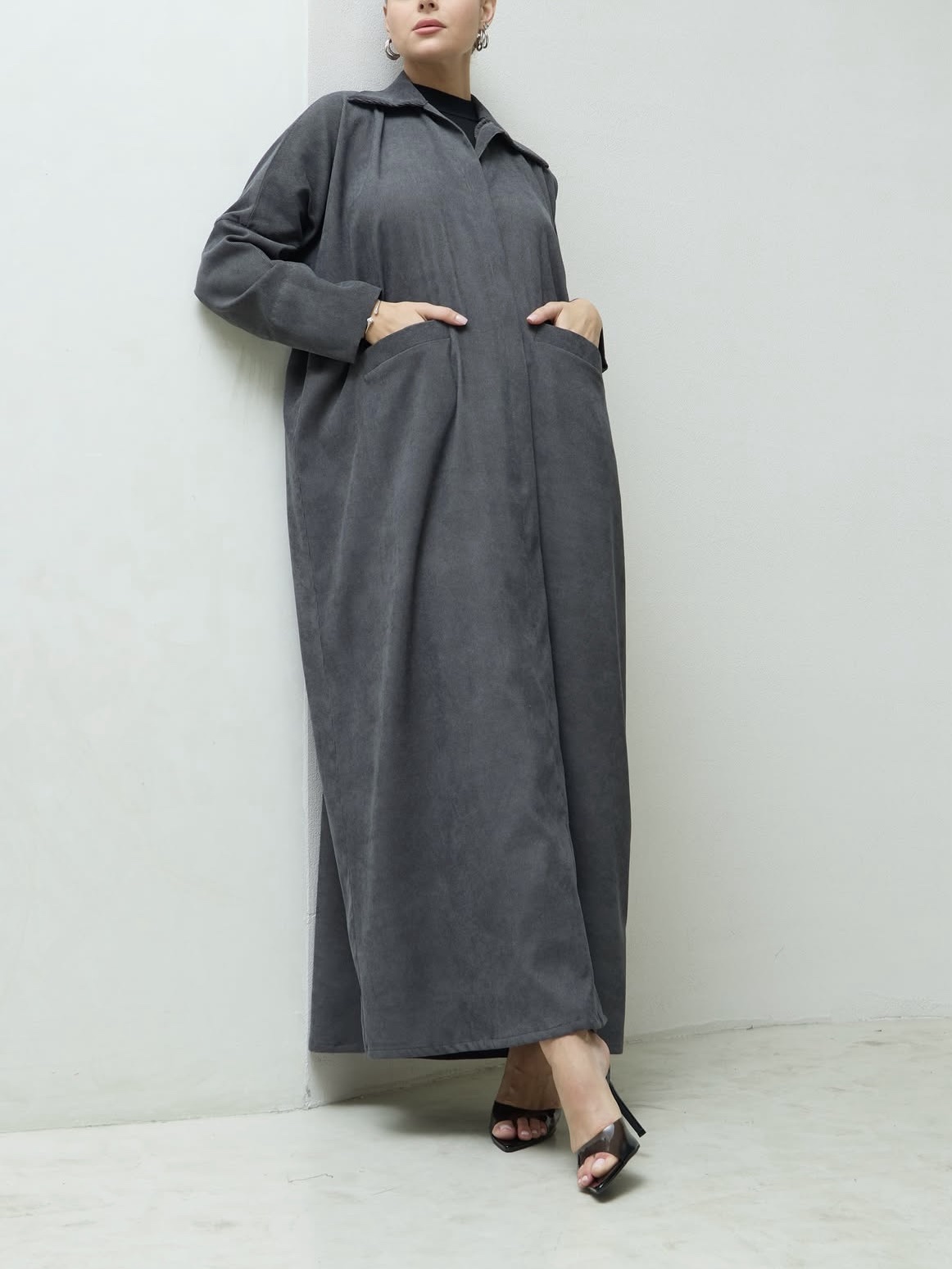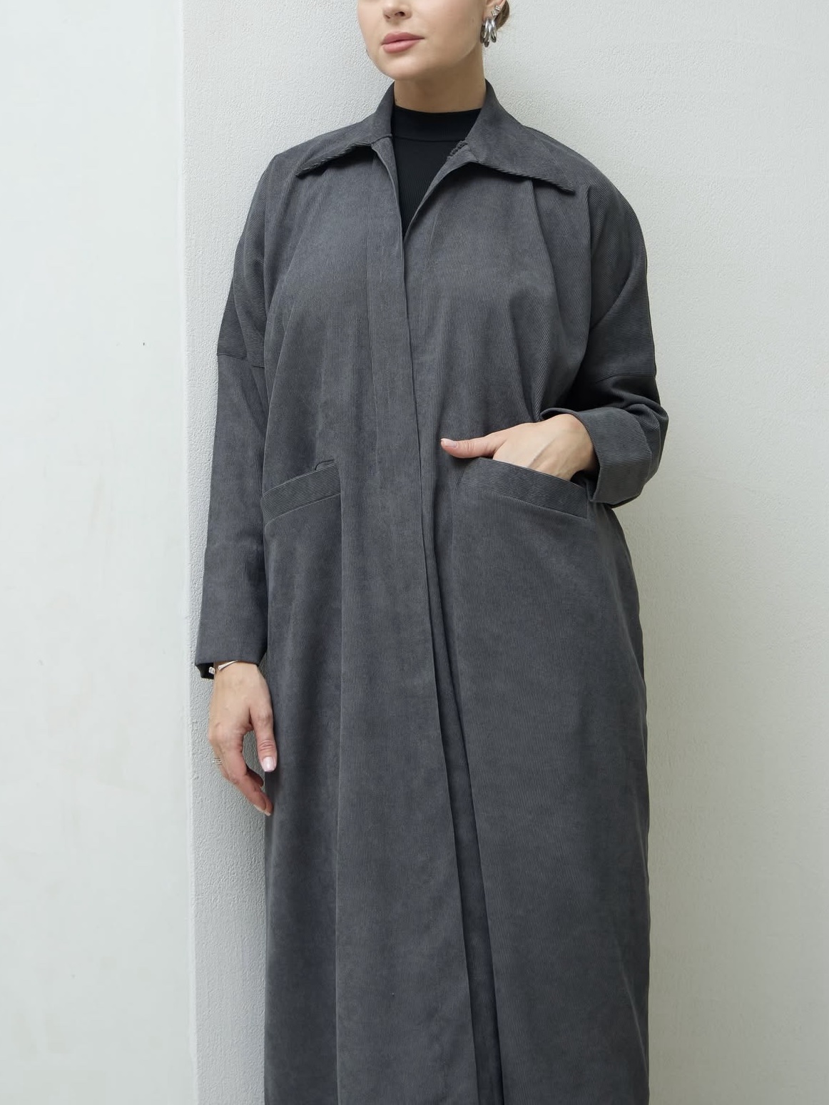 عباية تويد شتوية أنيقة بلون رمادي فاتح، بتصميم مستوحى من قصة الترنش الكلاسيكية، تجمع بين الفخامة والدفء بأسلوب عصري راقٍ.