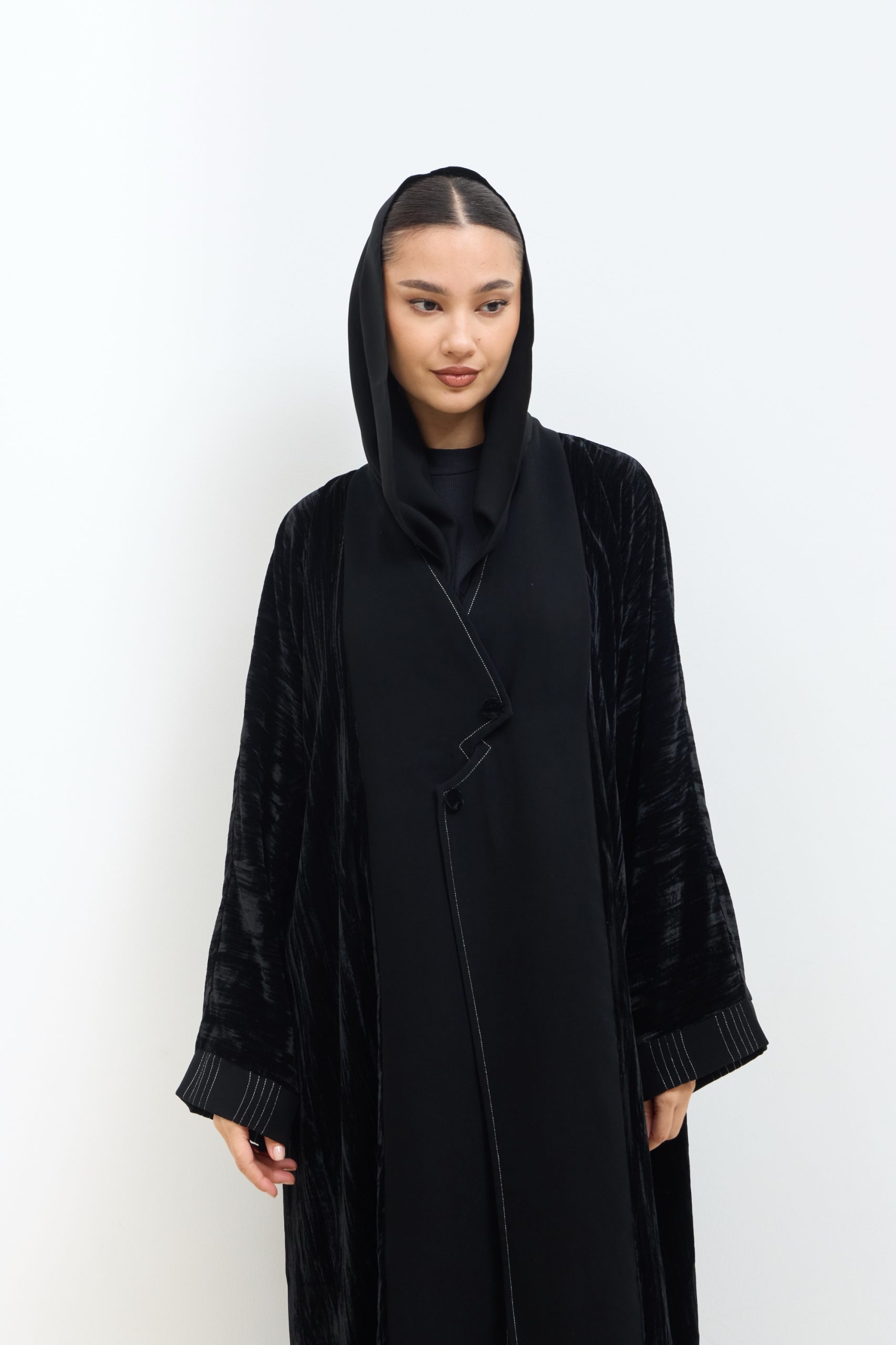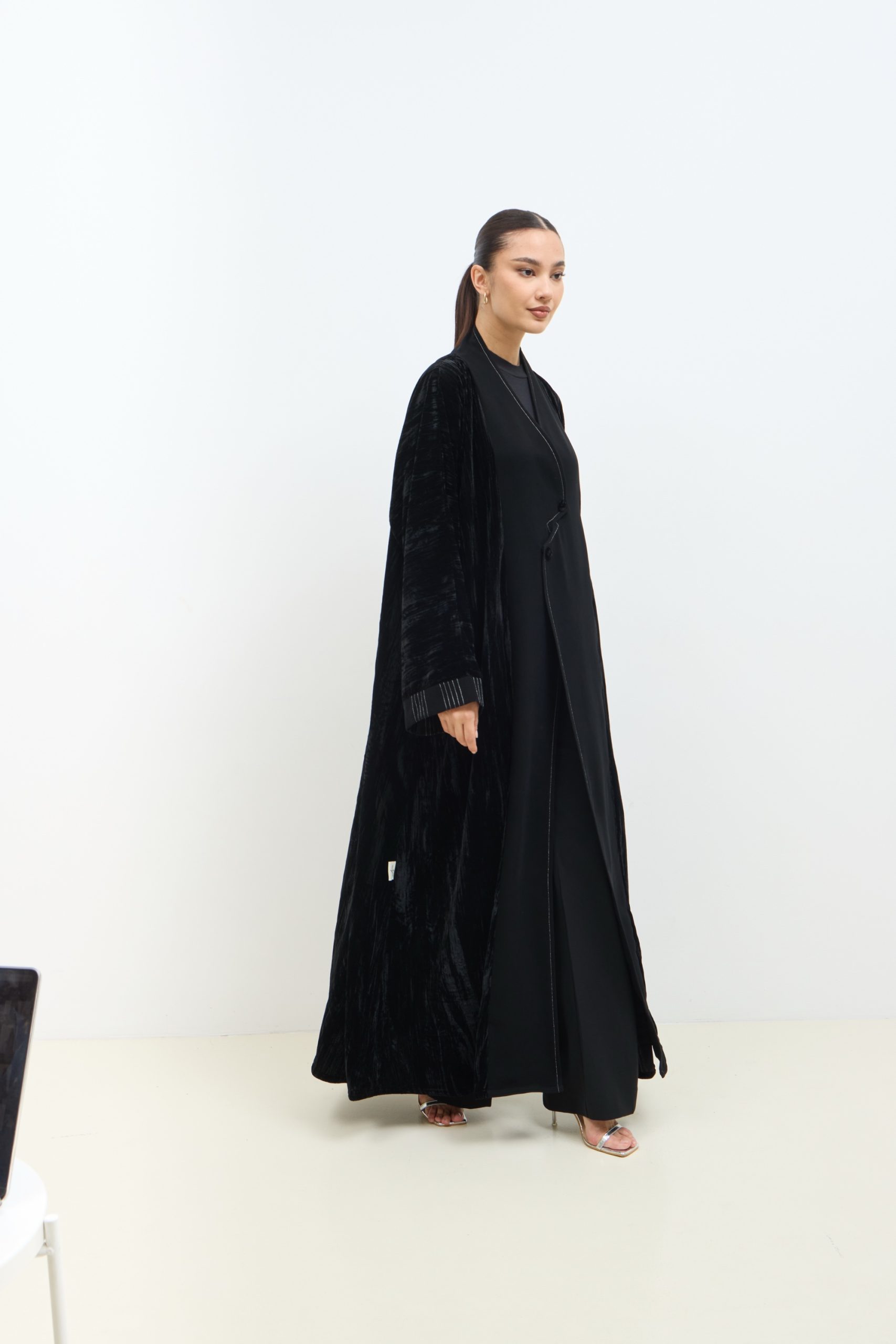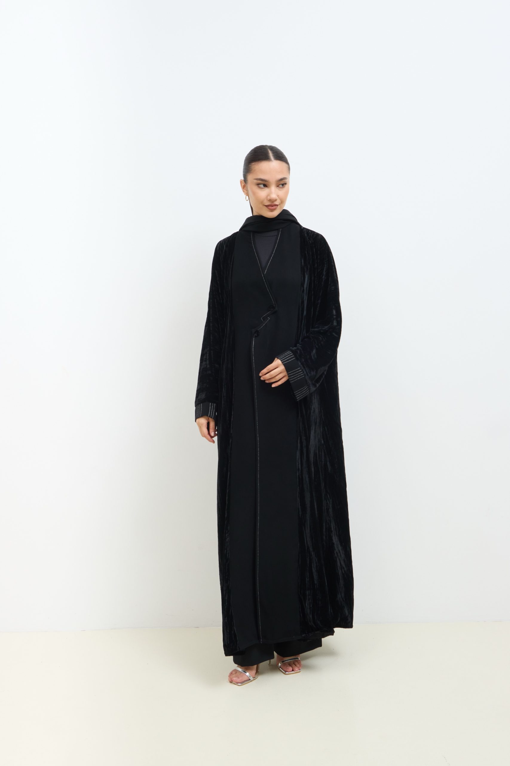 عباية ربع فراشة، تجمع بين قماش المخمل المكسر وكوبرا فيتنامي، مزينة بخياطة زري فضي غامق على الأطراف والأكمام، تمنحك فخامة ناعمة ولمسة عصرية راقية.