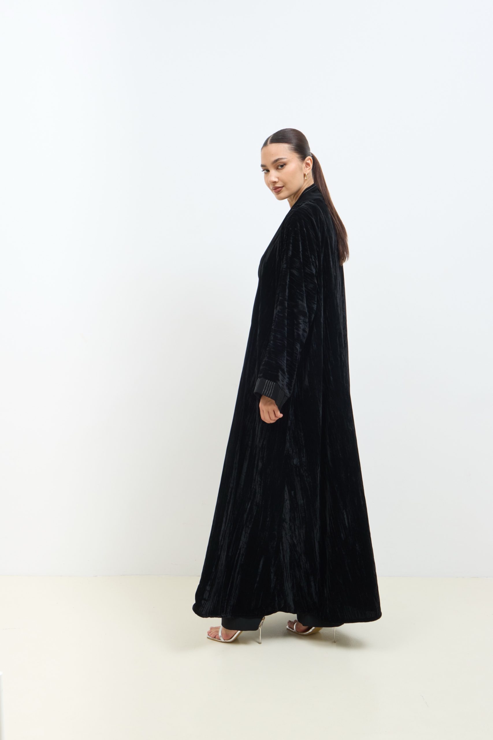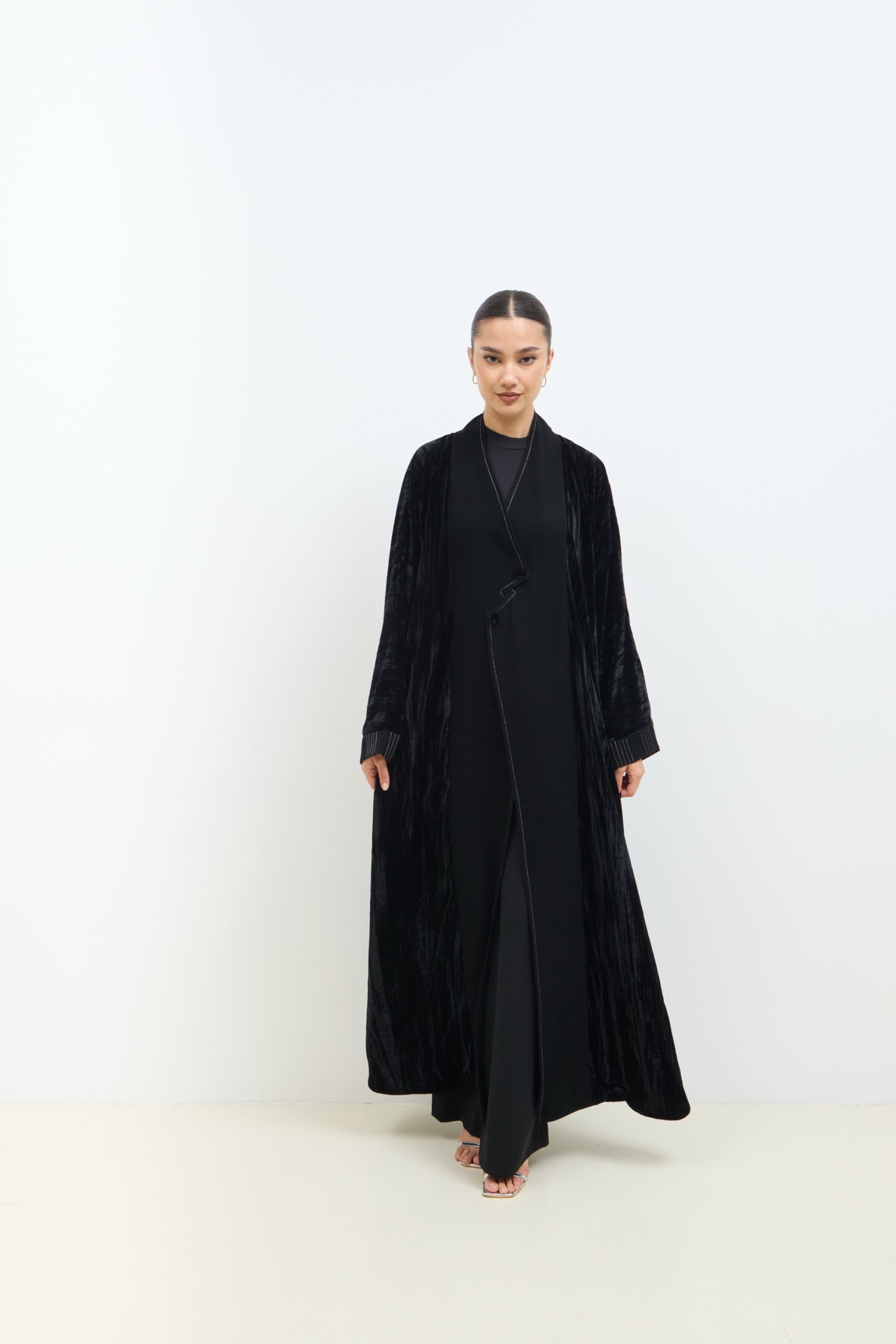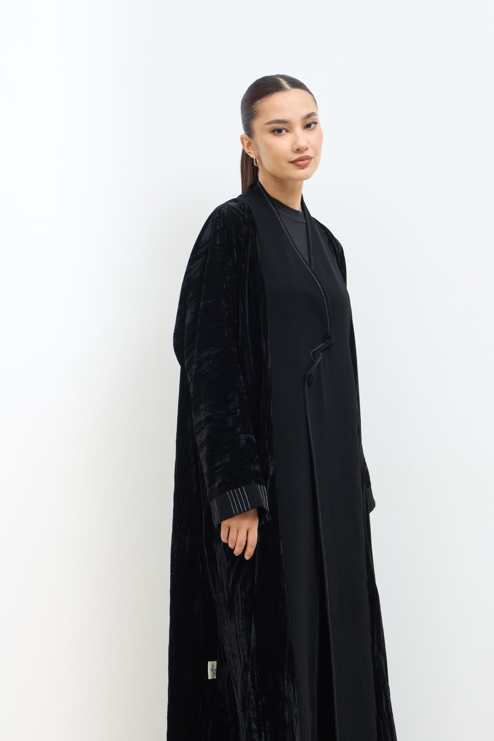 عباية ربع فراشة، تجمع بين قماش المخمل المكسر وكوبرا فيتنامي، مزينة بخياطة زري فضي غامق على الأطراف والأكمام، تمنحك فخامة ناعمة ولمسة عصرية راقية.