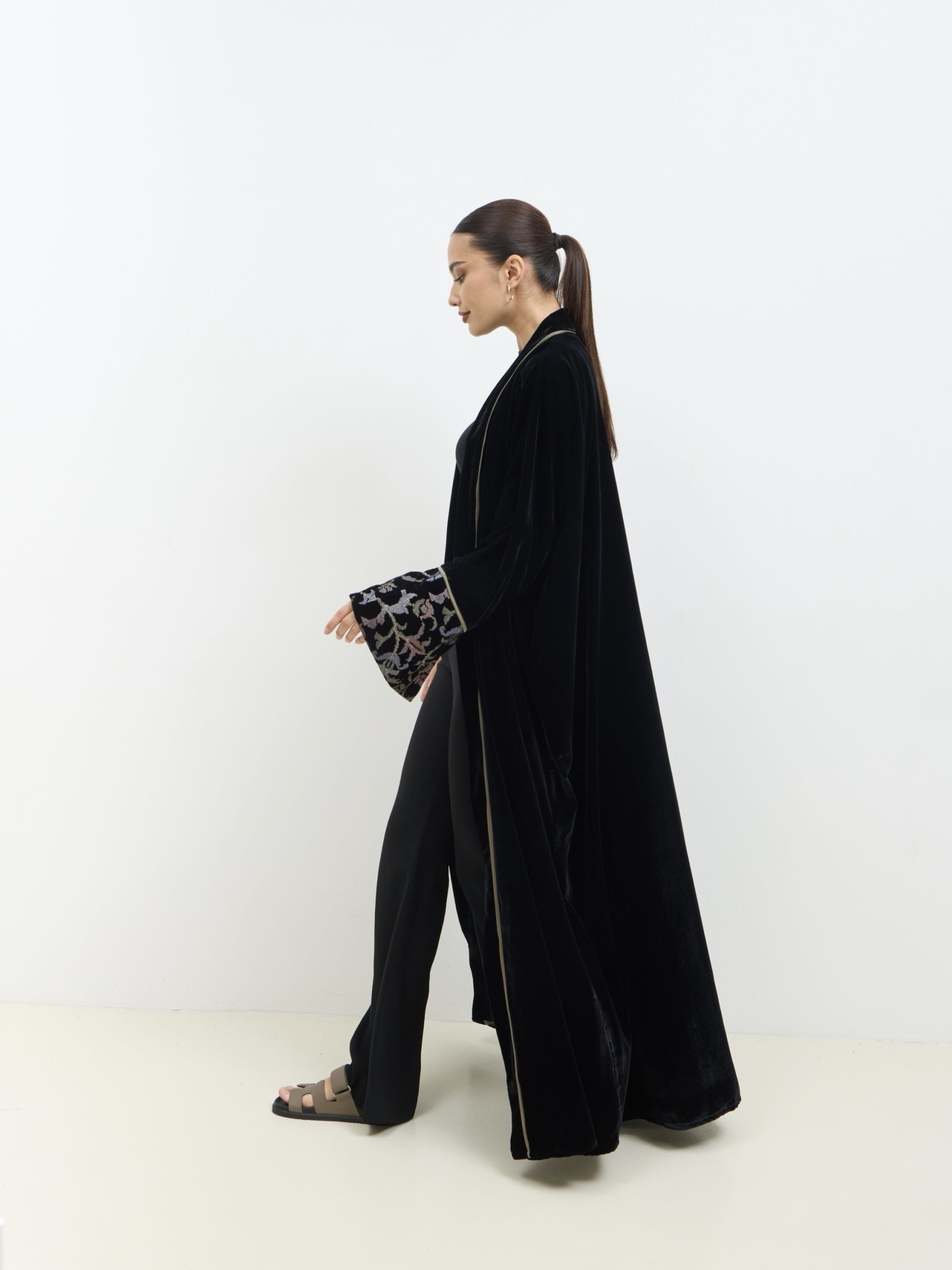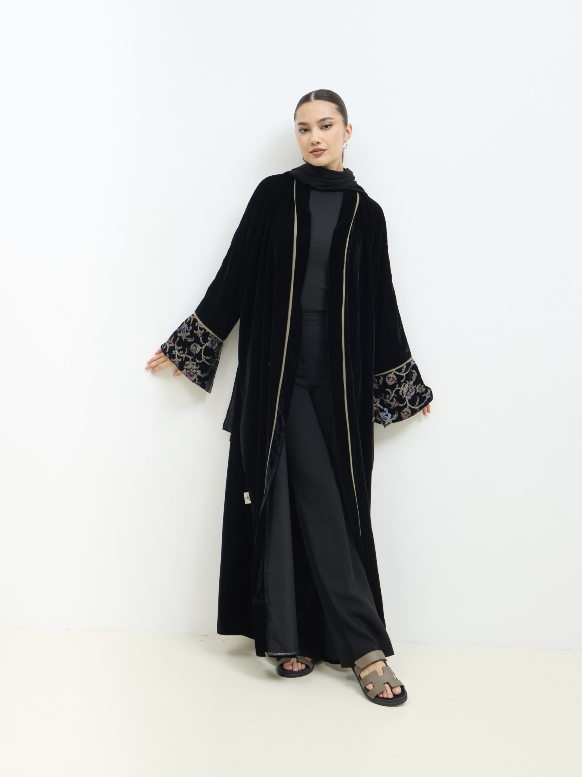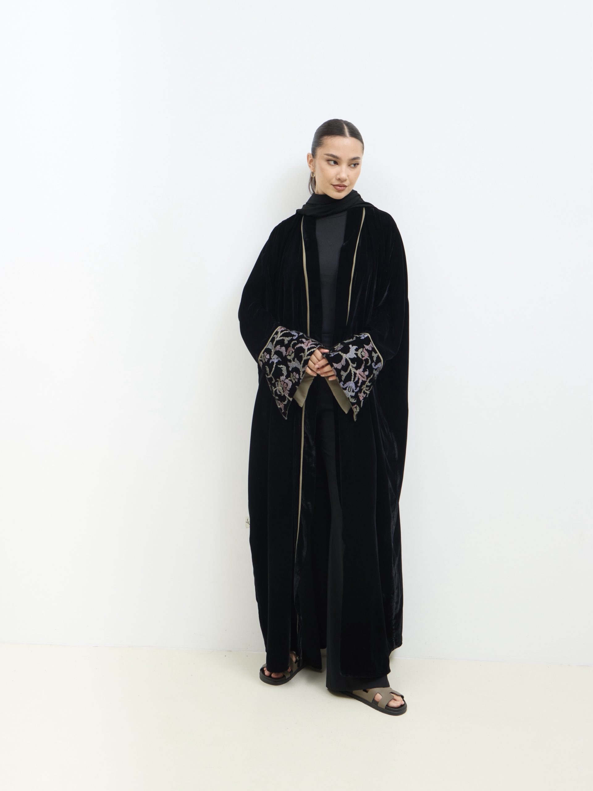 عباية مخمل سوداء بقصّة فراشة فاخرة، بتفاصيل تطريز راقية على الأكمام تمنحك إطلالة أنيقة وراقية.