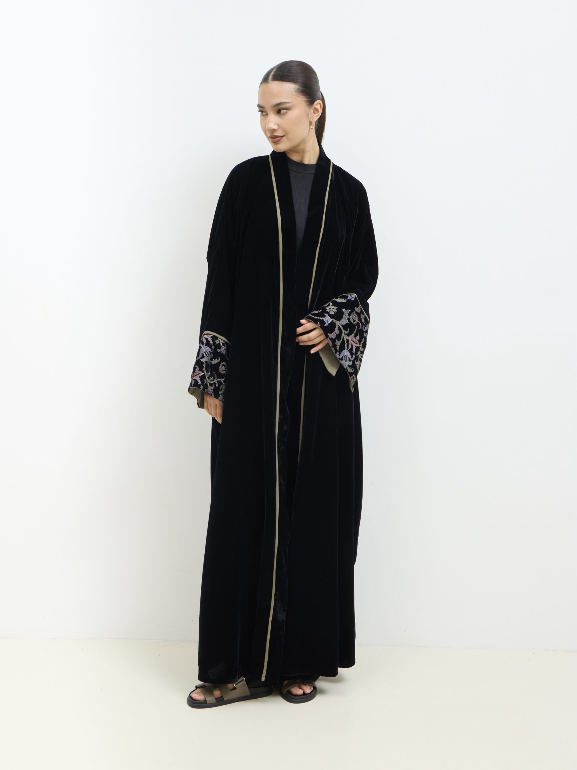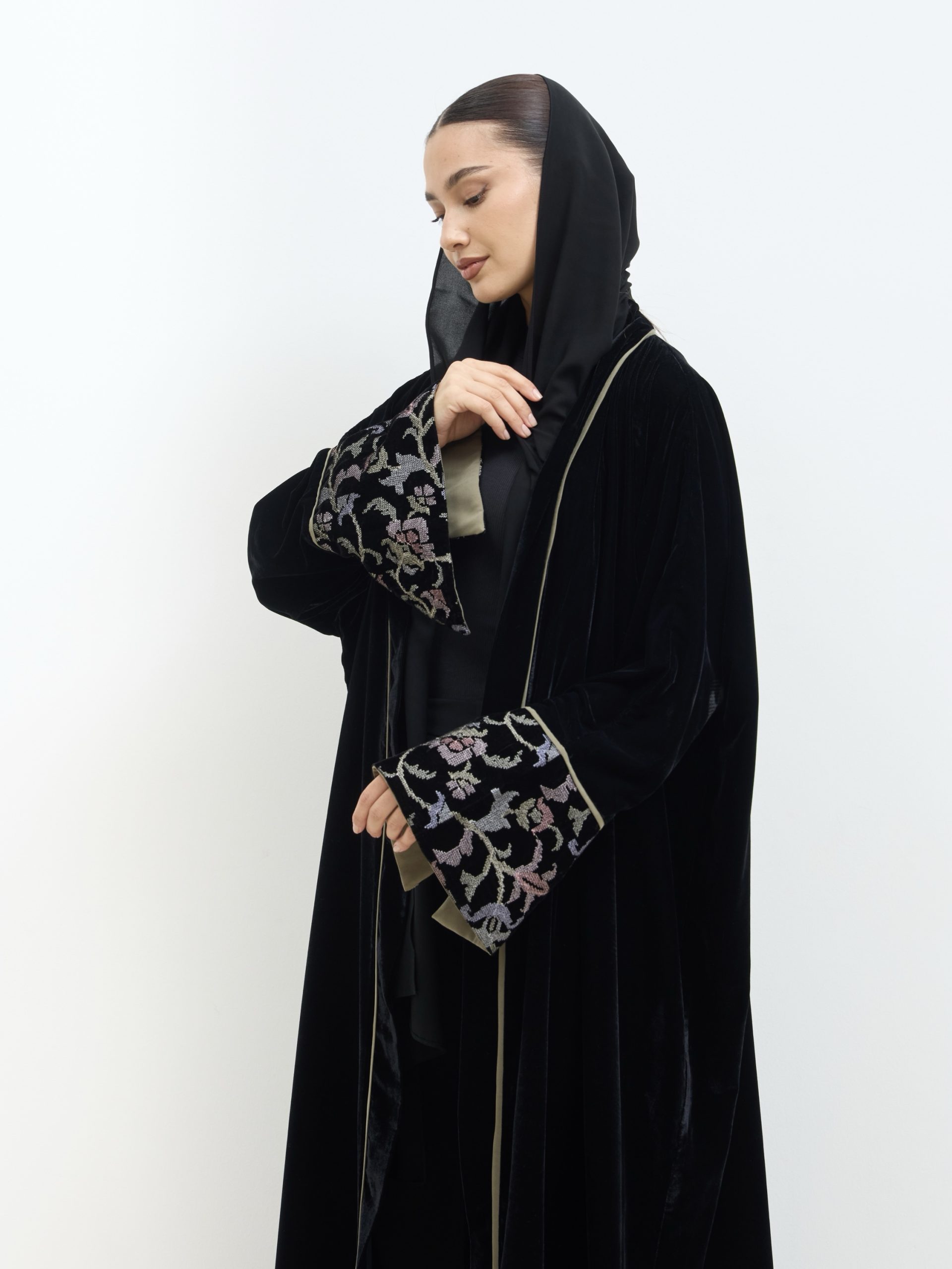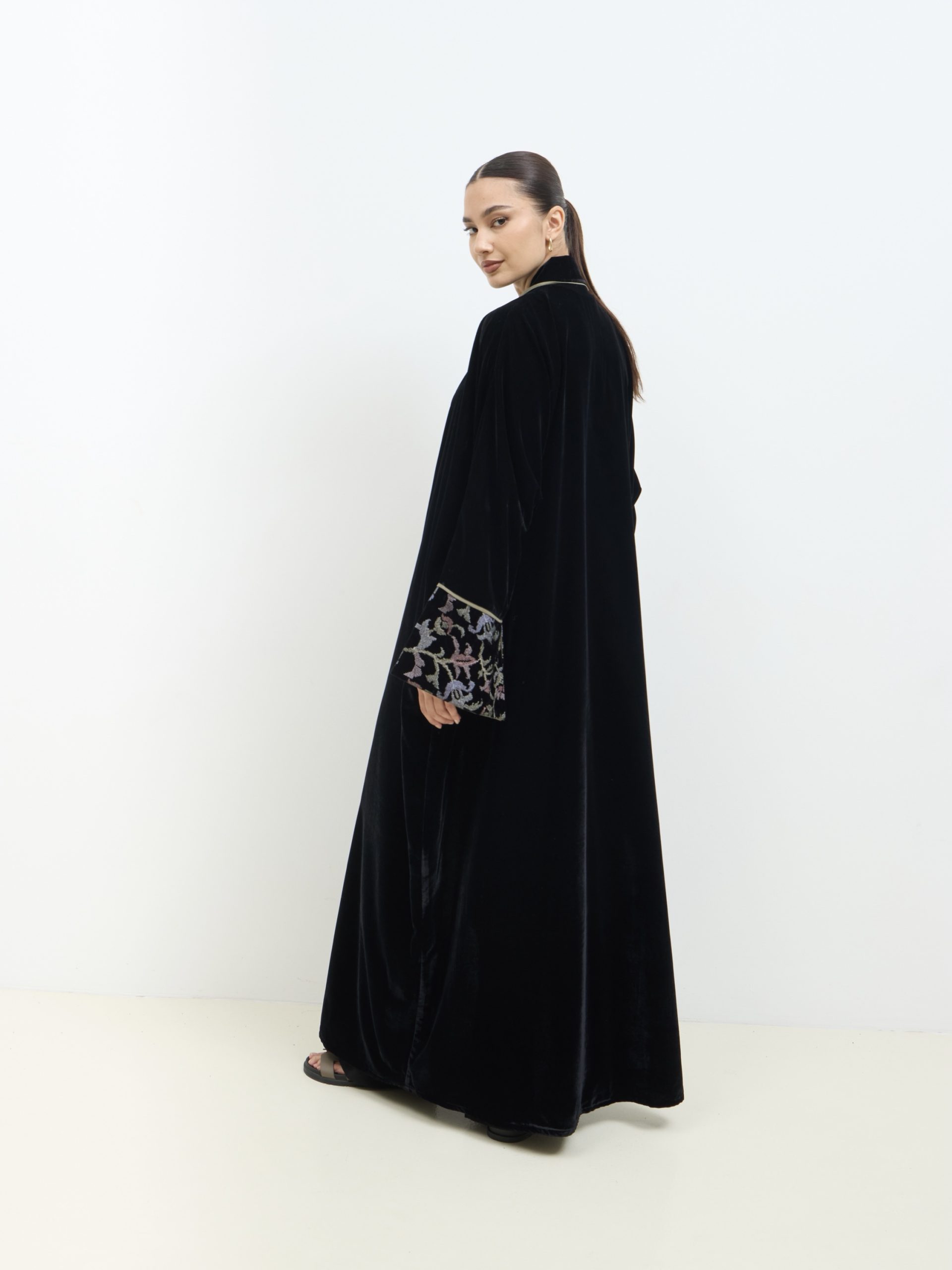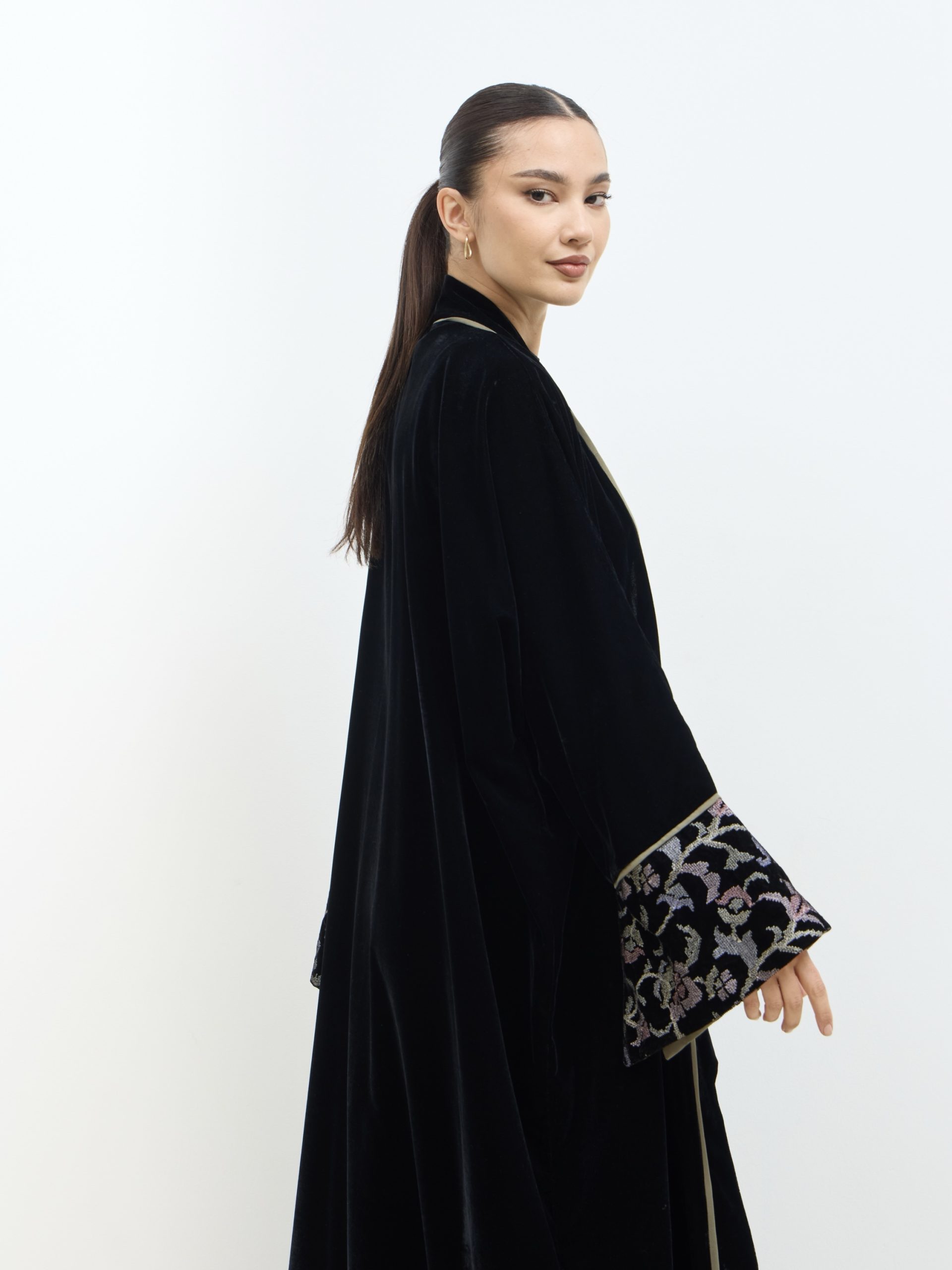 عباية مخمل سوداء بقصّة فراشة فاخرة، بتفاصيل تطريز راقية على الأكمام تمنحك إطلالة أنيقة وراقية.