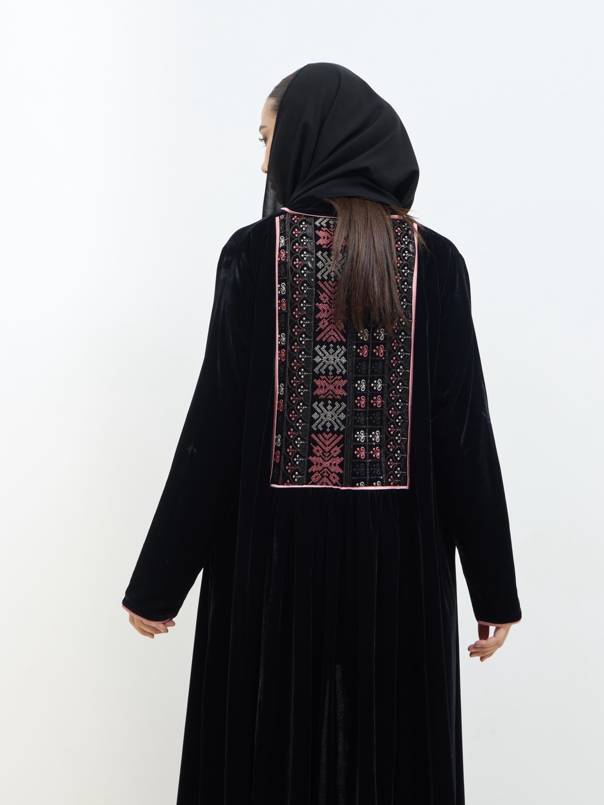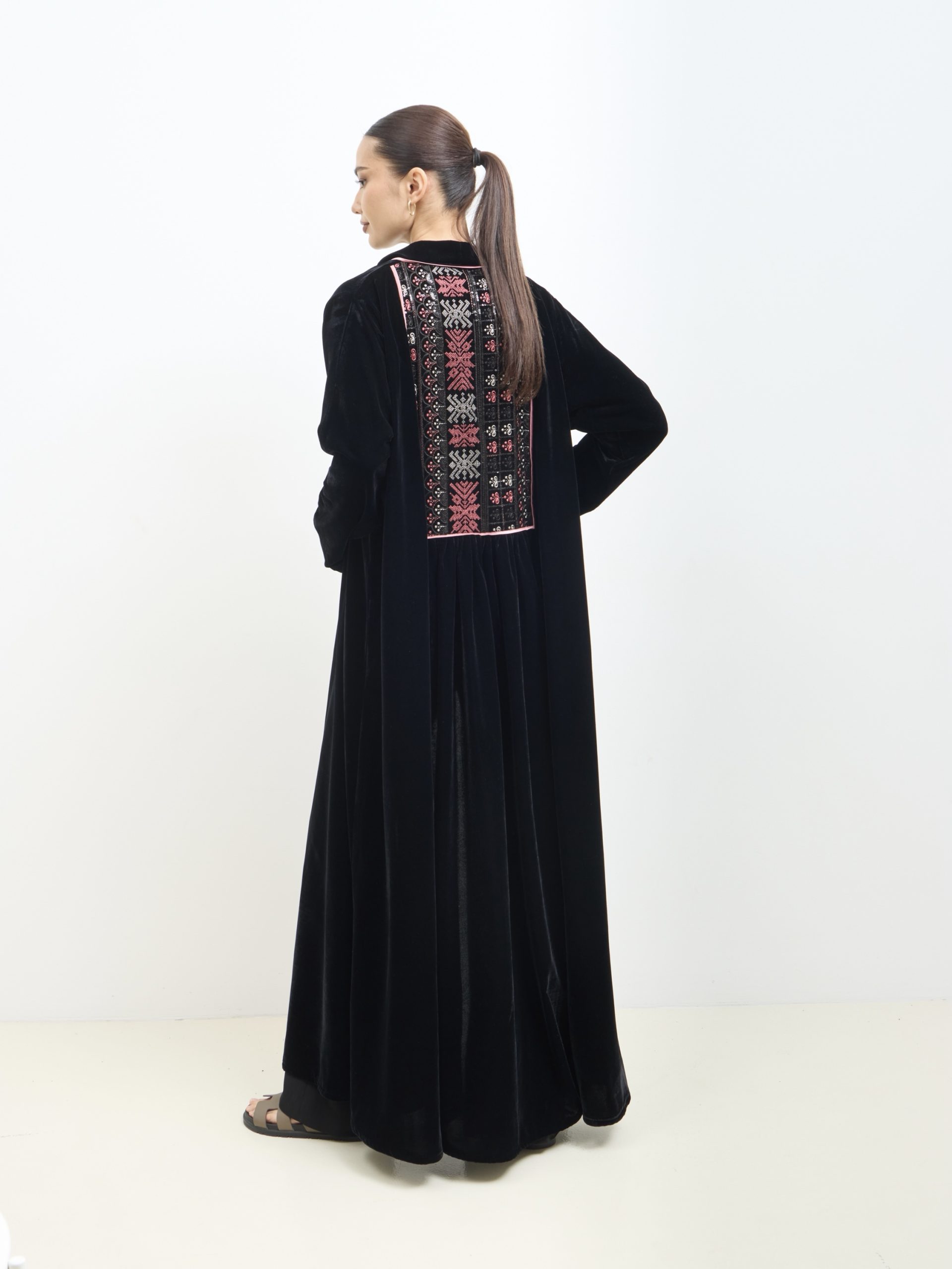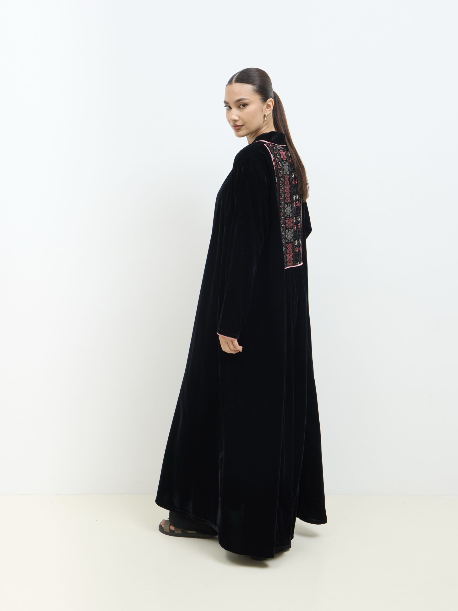 عباية مخمل كلوش بتطريز شرقي الطابع على الظهر، خامة فاخرة وانسيابية تمنح إطلالة راقية ومميزة.