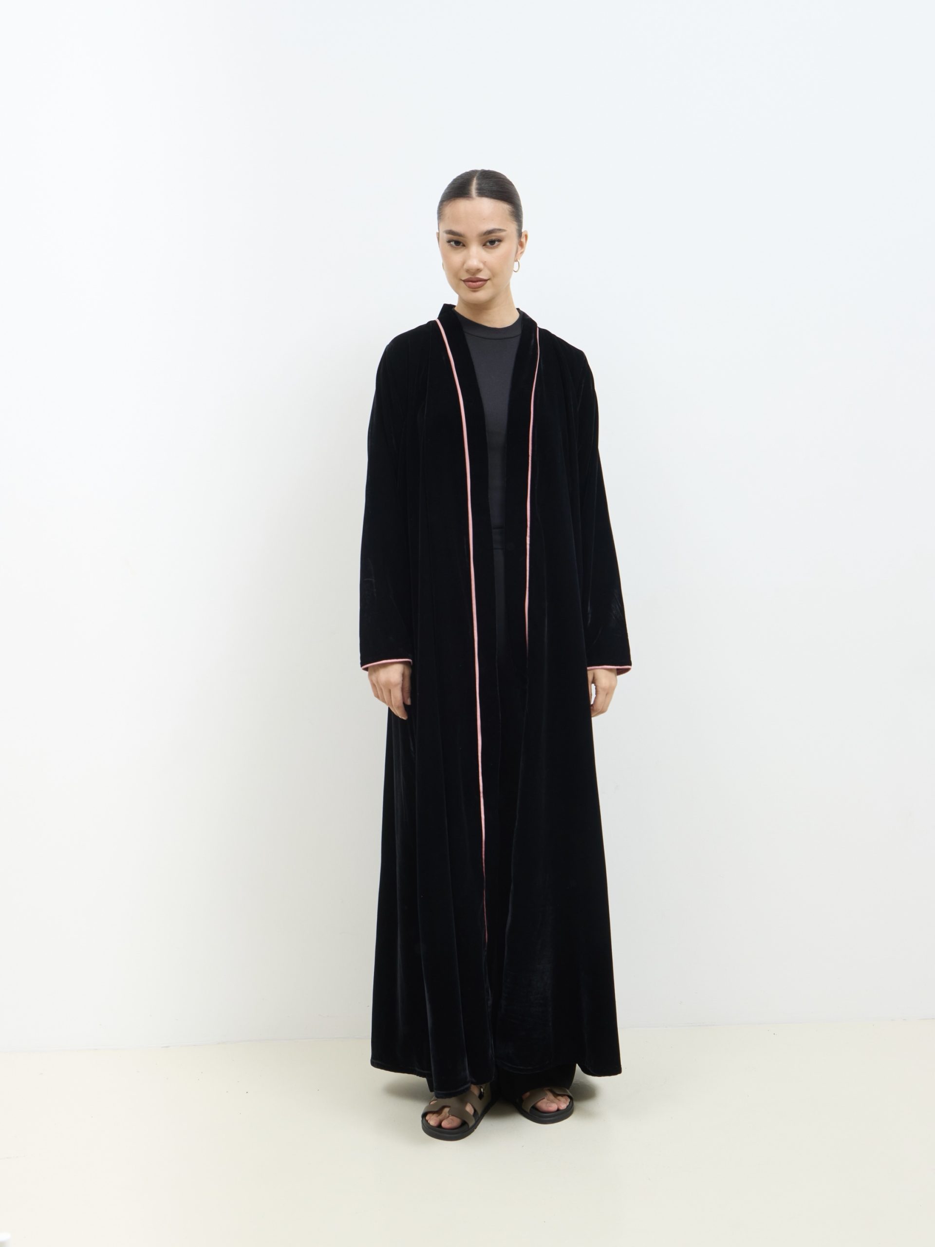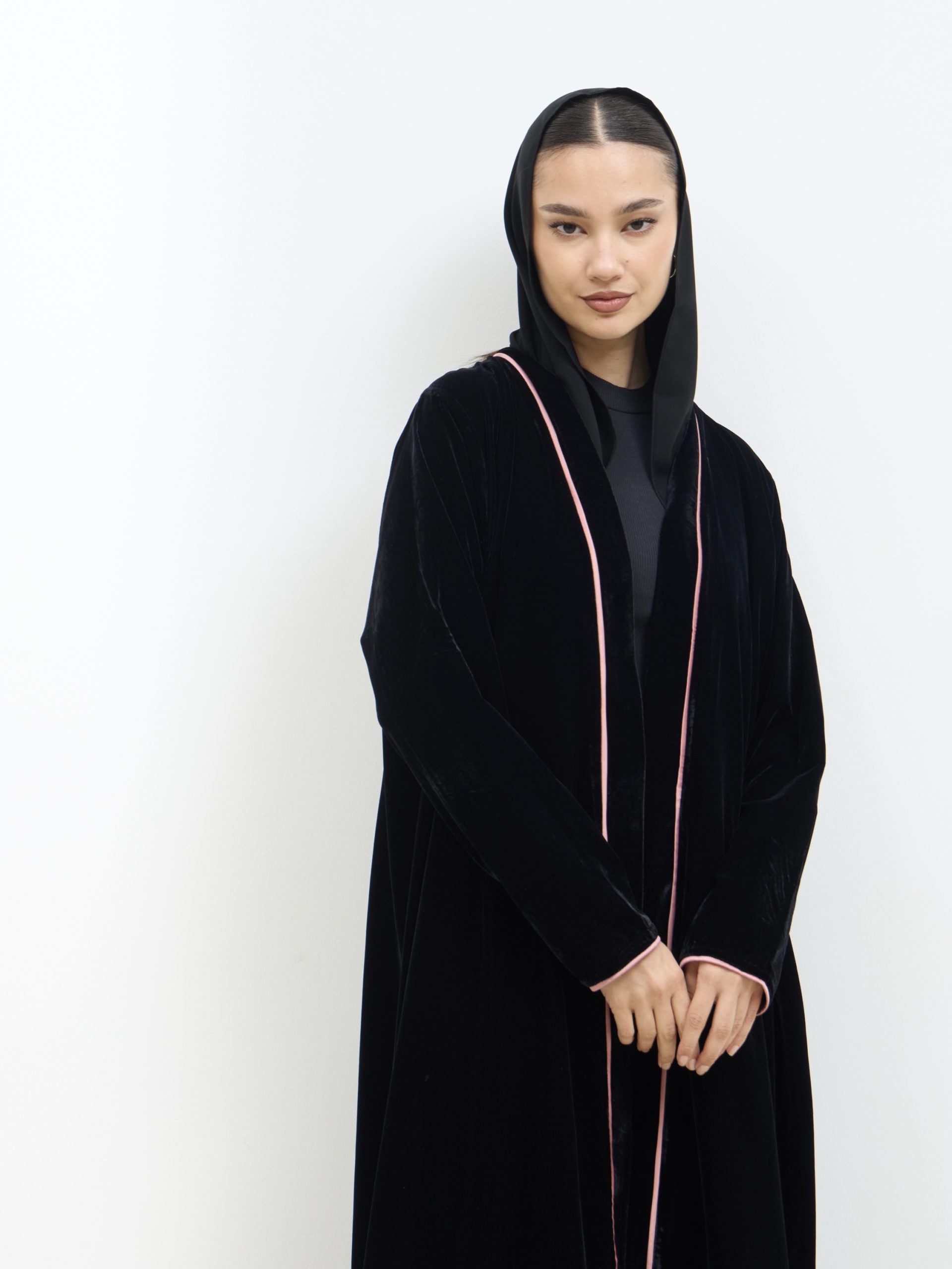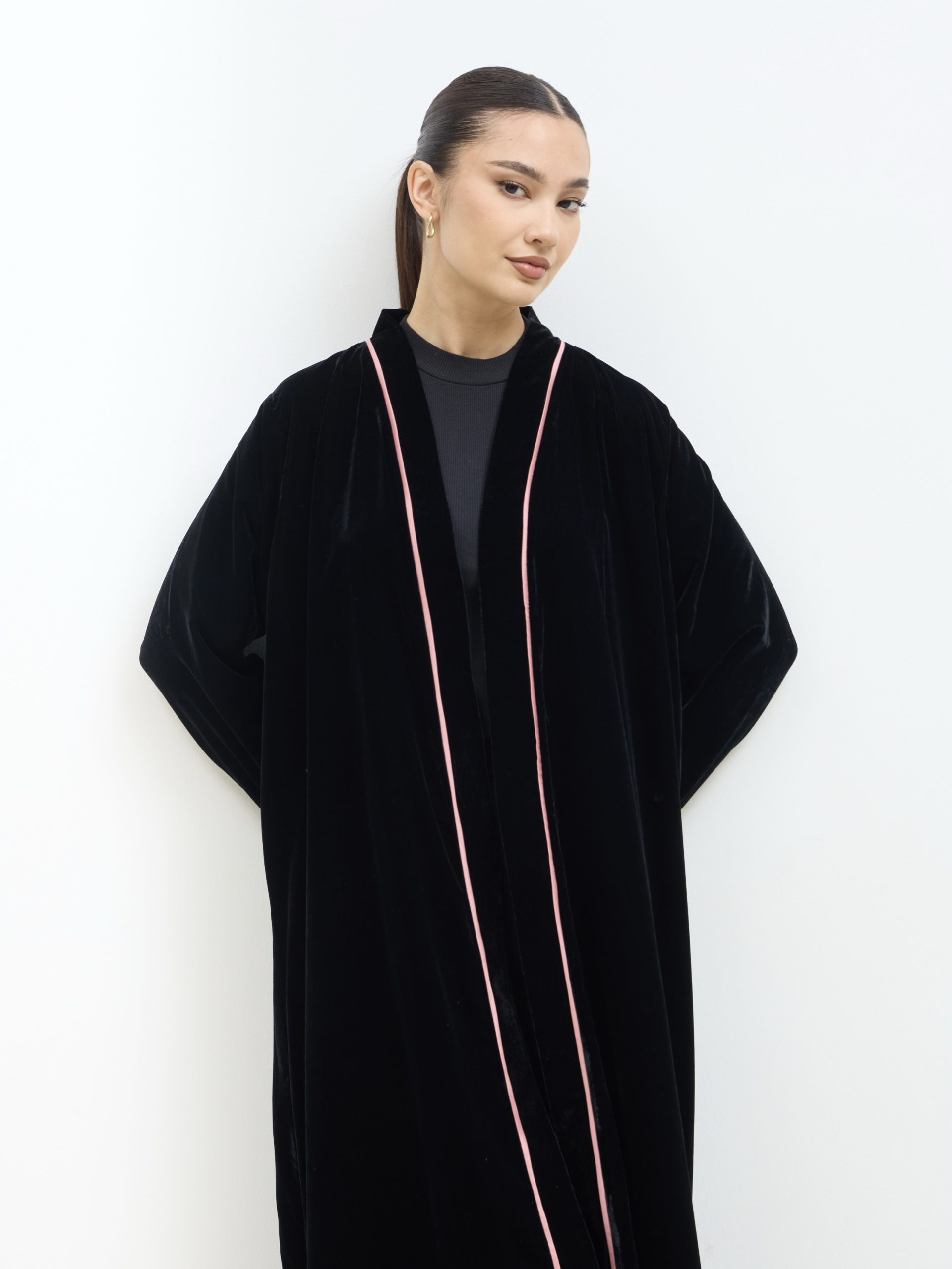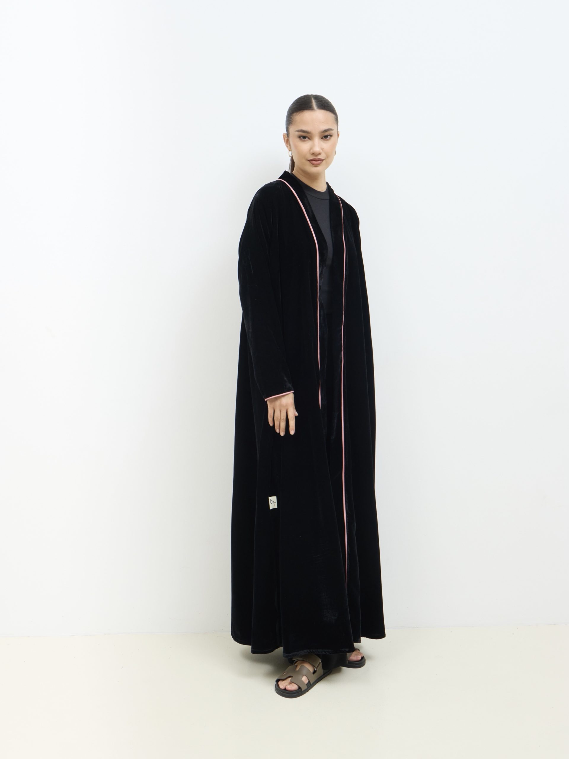 عباية مخمل كلوش بتطريز شرقي الطابع على الظهر، خامة فاخرة وانسيابية تمنح إطلالة راقية ومميزة.
